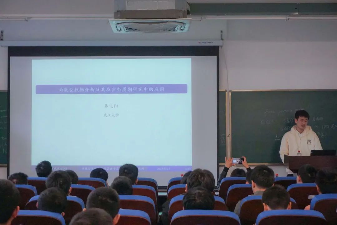 我校2019级数学弘毅班学生易飞阳做了《函数型数据分析及其在步态周期研究中的应用》报告。在报告中,他结合应用场景介绍了函数型数据分析中的一些主要理论与技术,并以运动捕捉数据集为例,简述函数型主成分分析与主微分分析在步态周期研究中的应用结果。