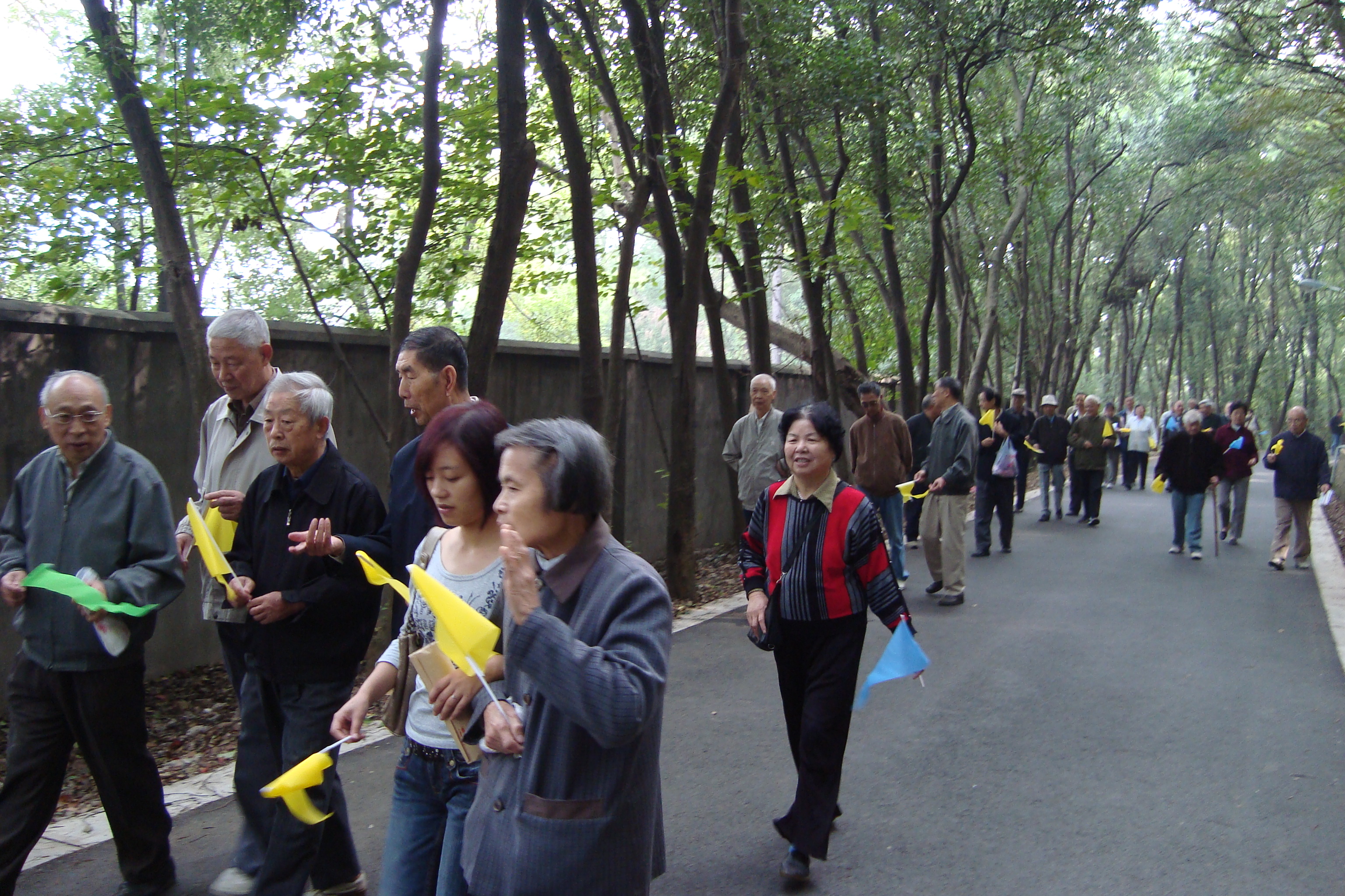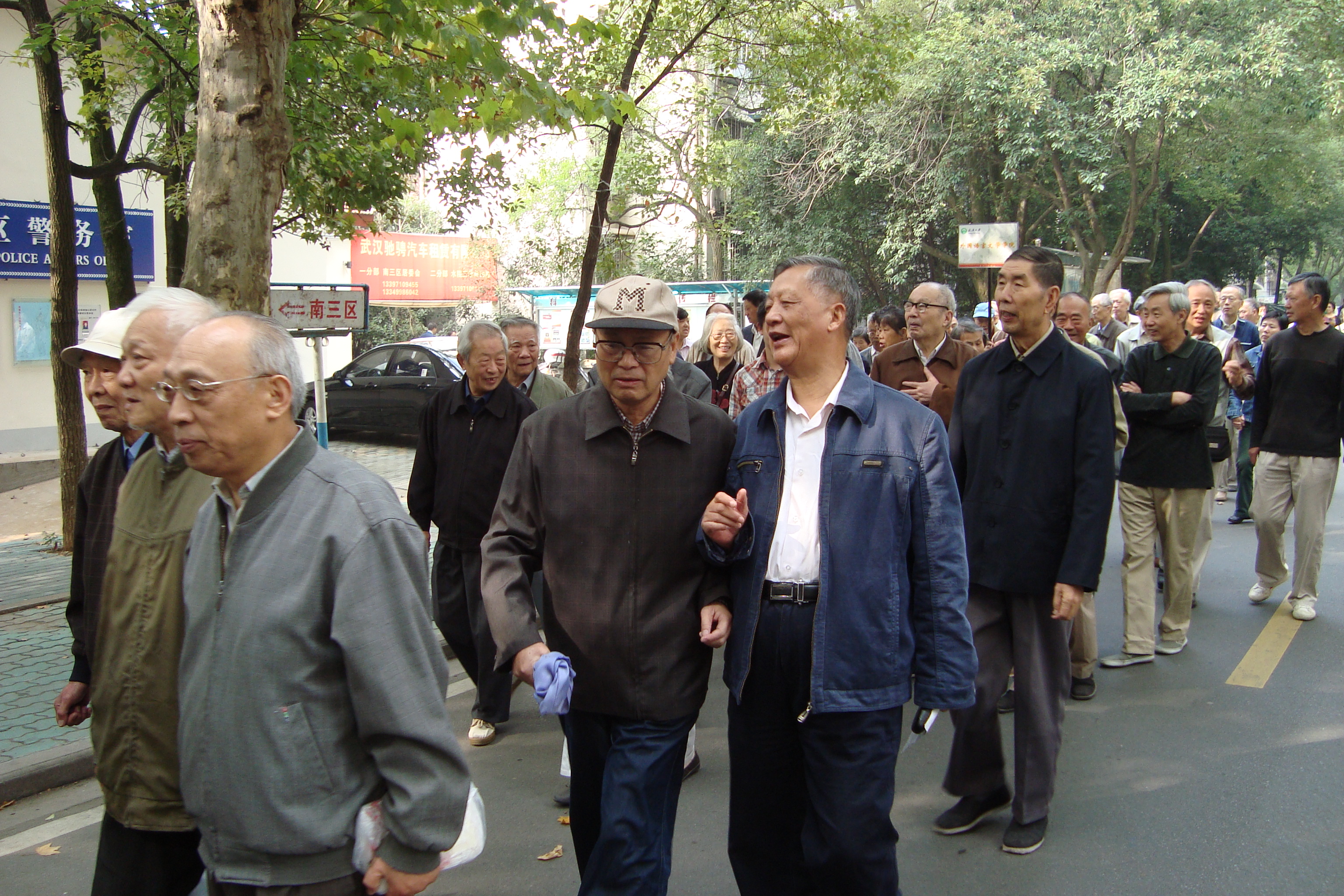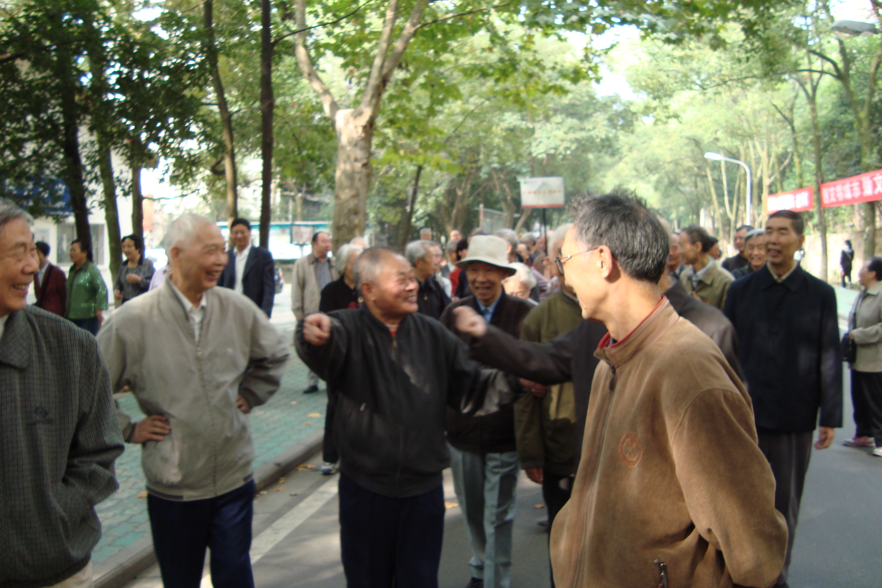 2008年10月8日上午,爱情岛 一区离退休教职工在学院党政办的组织下参加了校离退休工作处一区主办的2008年老年节登高活动。学院老教师们齐聚珞珈山下,漫步话家常。2007级研究生李婷婷、郑霁光作为学生代表全程陪同,带去了全院学生对老教师们的敬意与问候。