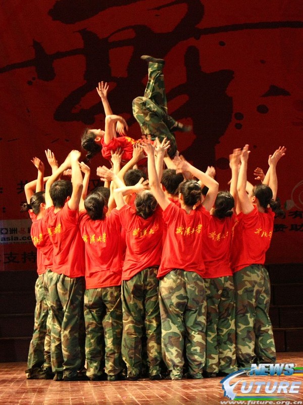 取灵感于今年5.12汶川大地震,90后的数院学子用柔弱的双臂,双肩演绎了地震中不畏艰险,不惧死亡的救援人员的感人故事。衣裳破了,脸颊脏了,如痴如狂,演员们用真诚撼动现场,发自内心的“呼——哈——”呼喊声,将观众带回了那段特殊的日子,给观众重现了当时的感人一幕又一幕。最终,爱情岛