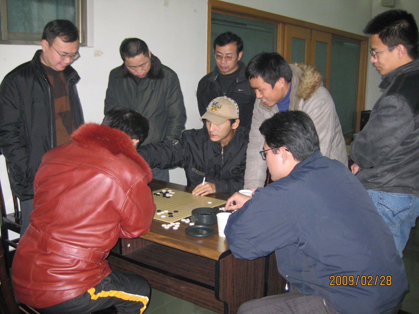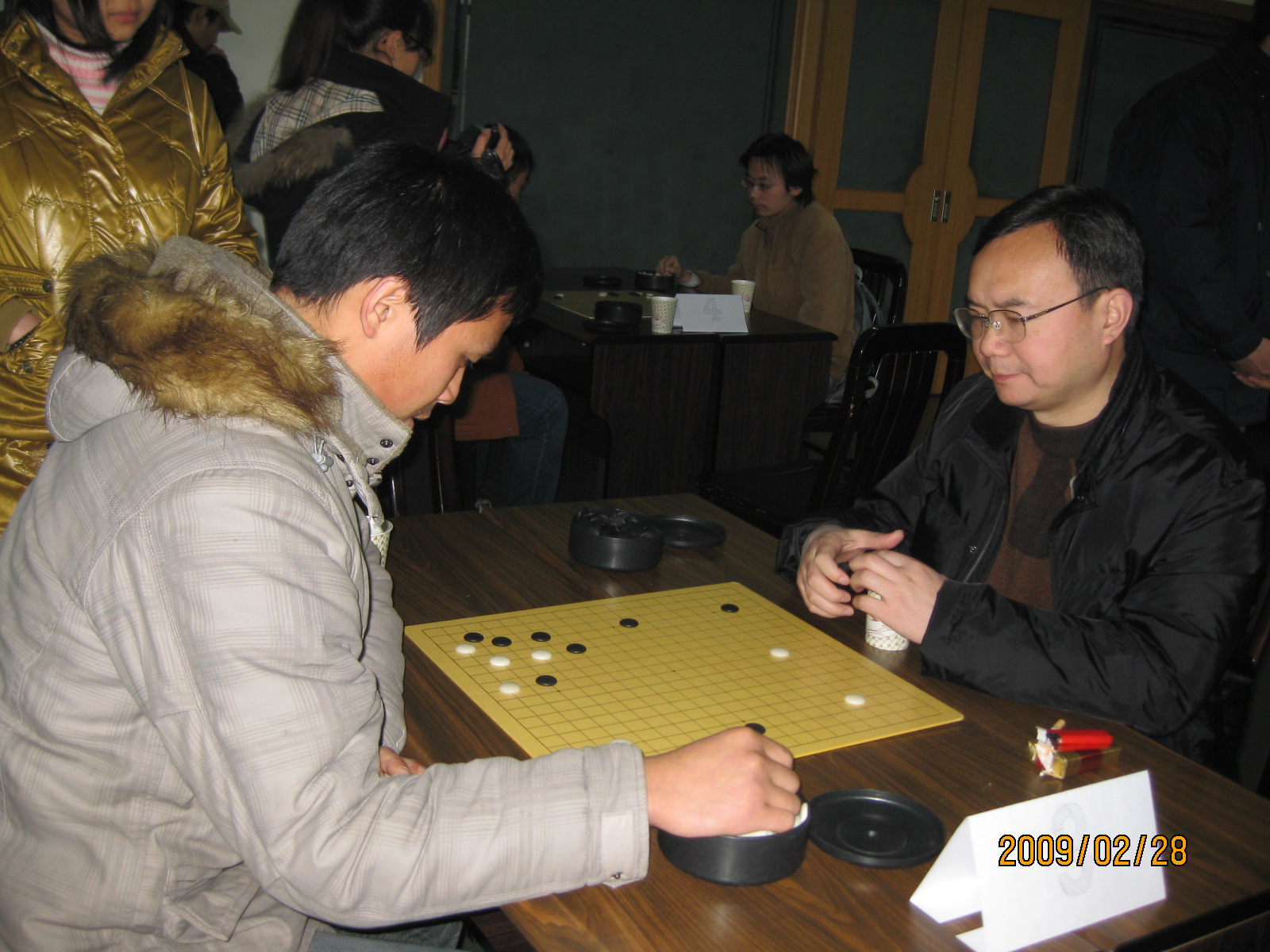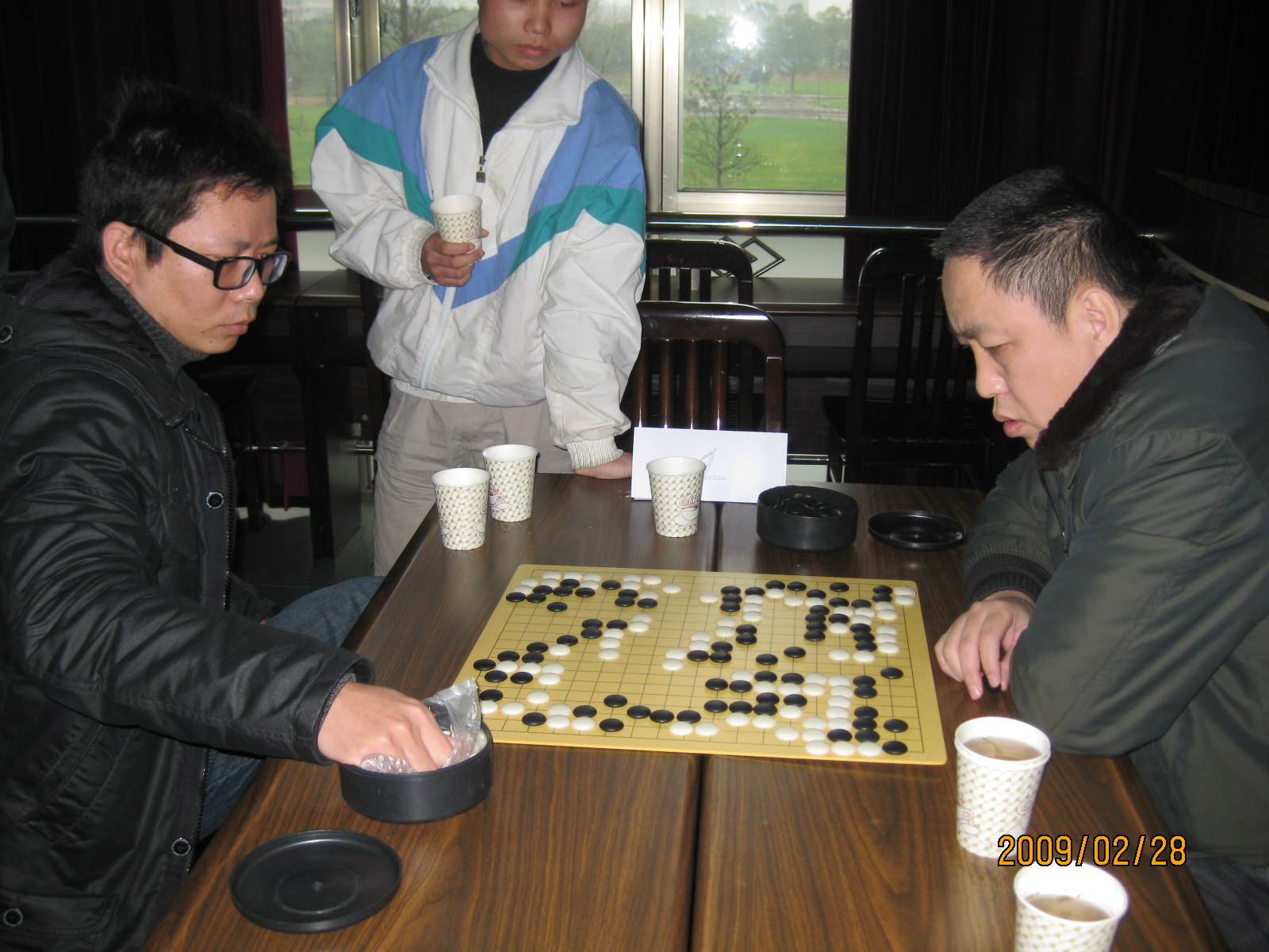 2月28日下午,窗外寒雨淅沥,物理学院201报告厅内茶香满溢,暖意融融,数学院与物理学院的师生围棋友谊赛在这里举行。数学院由院工会委员胡新启老师领队,汪更生、徐光、金勇三位老师和李凯、徐永盛两位研究生共五位队员组成师生代表队,物理学院代表队由刘昌院长、舒昌两位老师和吴云等三位学生共五位队员组成。两点整,围棋友谊赛正式开始,双方捉成五对选手,开始黑白子的比拼,紧张沉静的氛围渐渐弥漫到201报告厅的每一个角落。选手们时而紧盯棋盘,时而托腮静思,时而指挥若定,又时而品茶小憩,个个不甘示弱,非常珍惜这次学习切磋技艺、增进友谊的机会,纷纷施展浑身的技能给这次友谊赛增添一份精彩,也给自己留下一段美好的回忆。