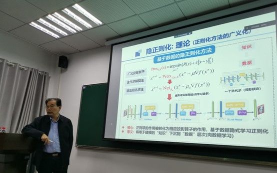 徐宗本院士的报告从经典的稀疏建模开始讲起,介绍了引入L(1/2)正则化理论的动机和原创思想,指出了它在图像处理、稀疏雷达等方面的重要应用。随后,他介绍了基于数据隐式学习正则化的理论和利用模型驱动深度学习的方法。最后,徐宗本院士介绍了隐正则化理论在实现超快核磁共振成像、分布式微剂量CT成像中的应用突破。徐宗本院士指出隐正则化的重要价值在于对于先验的把握与运用从“知识要求”层次降低到“从数据(观测)中学”的层次,模型与数据混合驱动将在未来解决实际问题中发挥重要的作用。