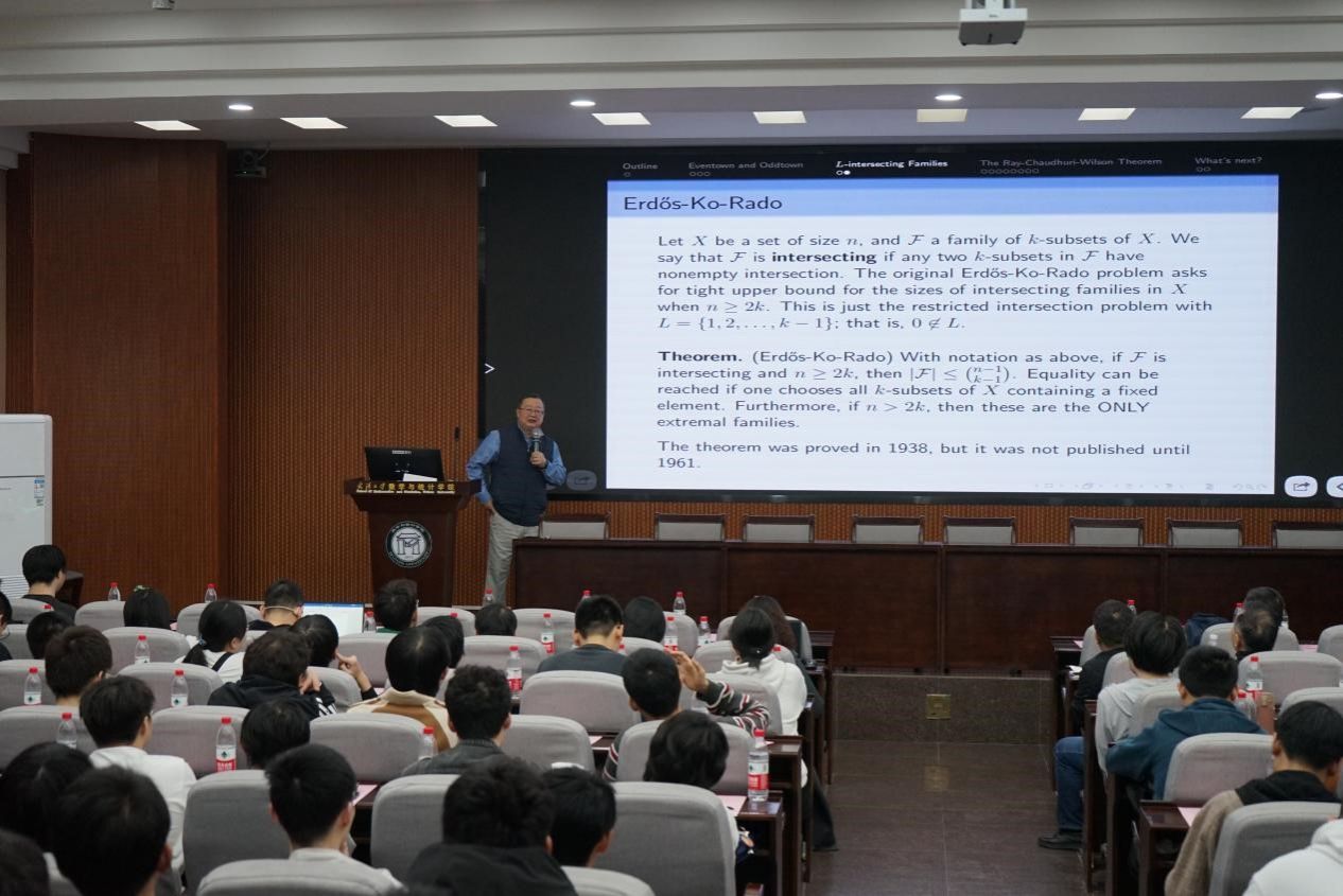 向青作题为”Application of Linear Algebra in Combinatorics”的学术报告,他以深入浅出的讲解和经典易懂的例子为同学们展示了线性代数在组合中的应用。