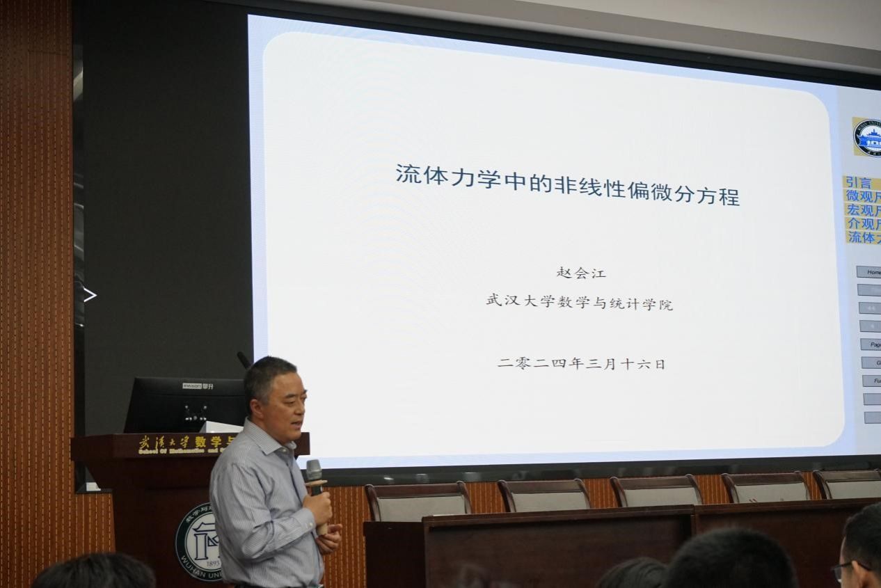 赵会江对兄弟高校参会师生表示欢迎,他希望各高校在人才培养工作上继续加强沟通合作,为学生提供更加优质的成长和学习环境。他做了题为“流体力学中的非线性偏微分方程”的学术报告,向同学们展示了不同情况下为了描述流体所提出的不同方程组,也给出了当下偏微分方程领域的主要研究进展和有待解决的问题。