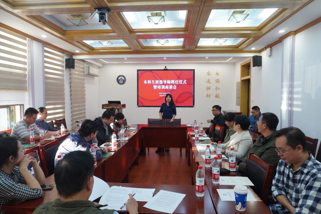 为进一步加强“三全育人”工作,提升本科生教育管理工作质量,10�24日下午,我院�205会议室举行本科生班级导师聘任仪式暨培训座谈会。院党委书记李勤、党委副书记刘珊珊、本科生班级导师和全体本科生辅导员参加会议,会议由学生工作办公室主任胡法拉主持�