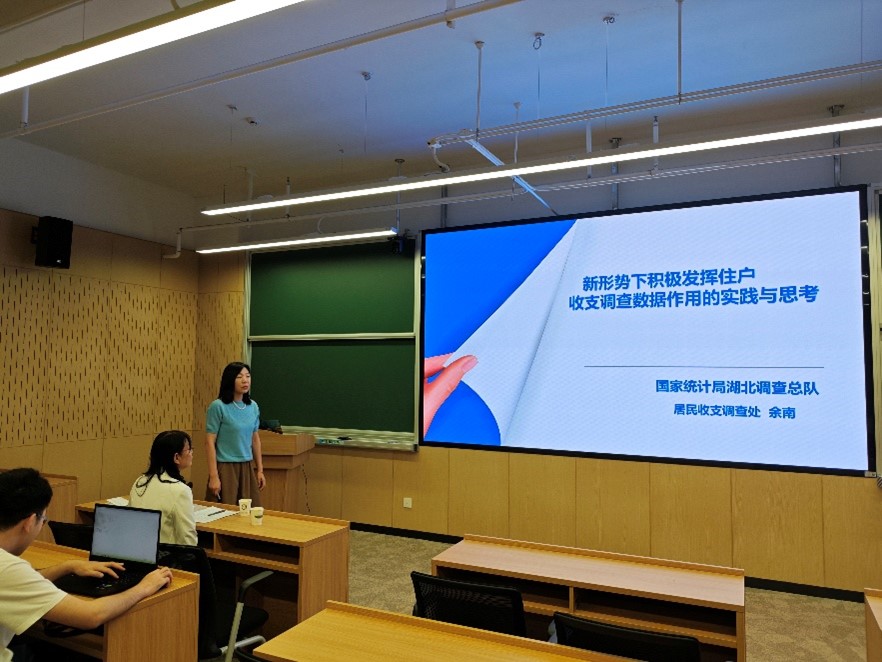 国家统计局湖北调查总队劳动力处处长、高级统计师杨琳以《漫谈劳动力调查》为题,从调查范围、频率、抽样方法等维度全面梳理劳动力调查的框架。她重点剖析了调查员职责的规范性要求,强调“服从指导”“入户调查”“独立上报”“数据保密”等六条红线对保障数据真实性的重要意义。互动环节中,杨琳结合“长期患病是否算失业”“退休人员是否纳入失业统计”等案例,与师生展开热烈讨论,增进了在场师生对于劳动力调查的认知与了解。