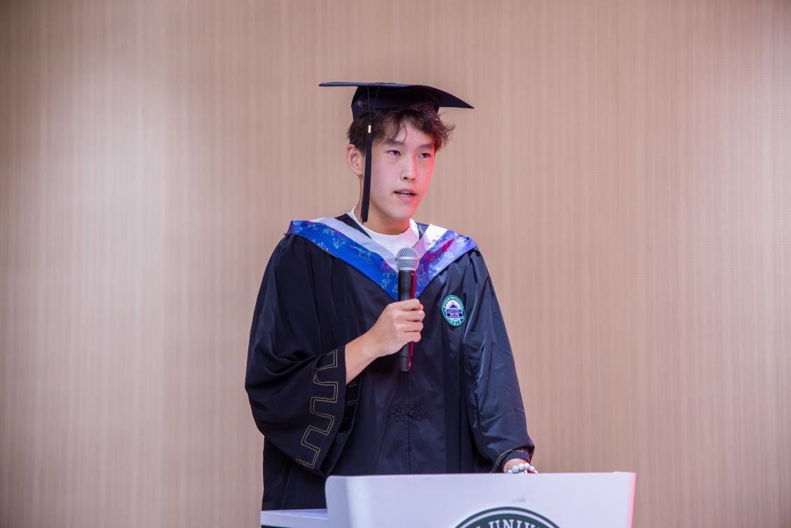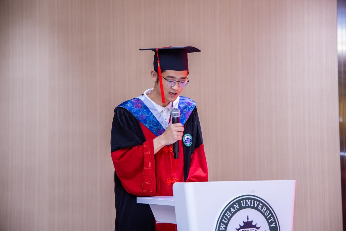 研究生代表�2025届基础数学专业博士毕业生郑超同学发言。他分享了自己在武大六年的求学与科研经历,诚挚感谢了导师的悉心指导以及同窗的并肩支持。他回顾了与导师探讨学术、与伙伴们挑灯夜读的点点滴滴,鼓励大家珍惜校园时光、勇于拥抱挑战,脚踏实地探索,并呼吁毕业生“善待不完美的自己”�