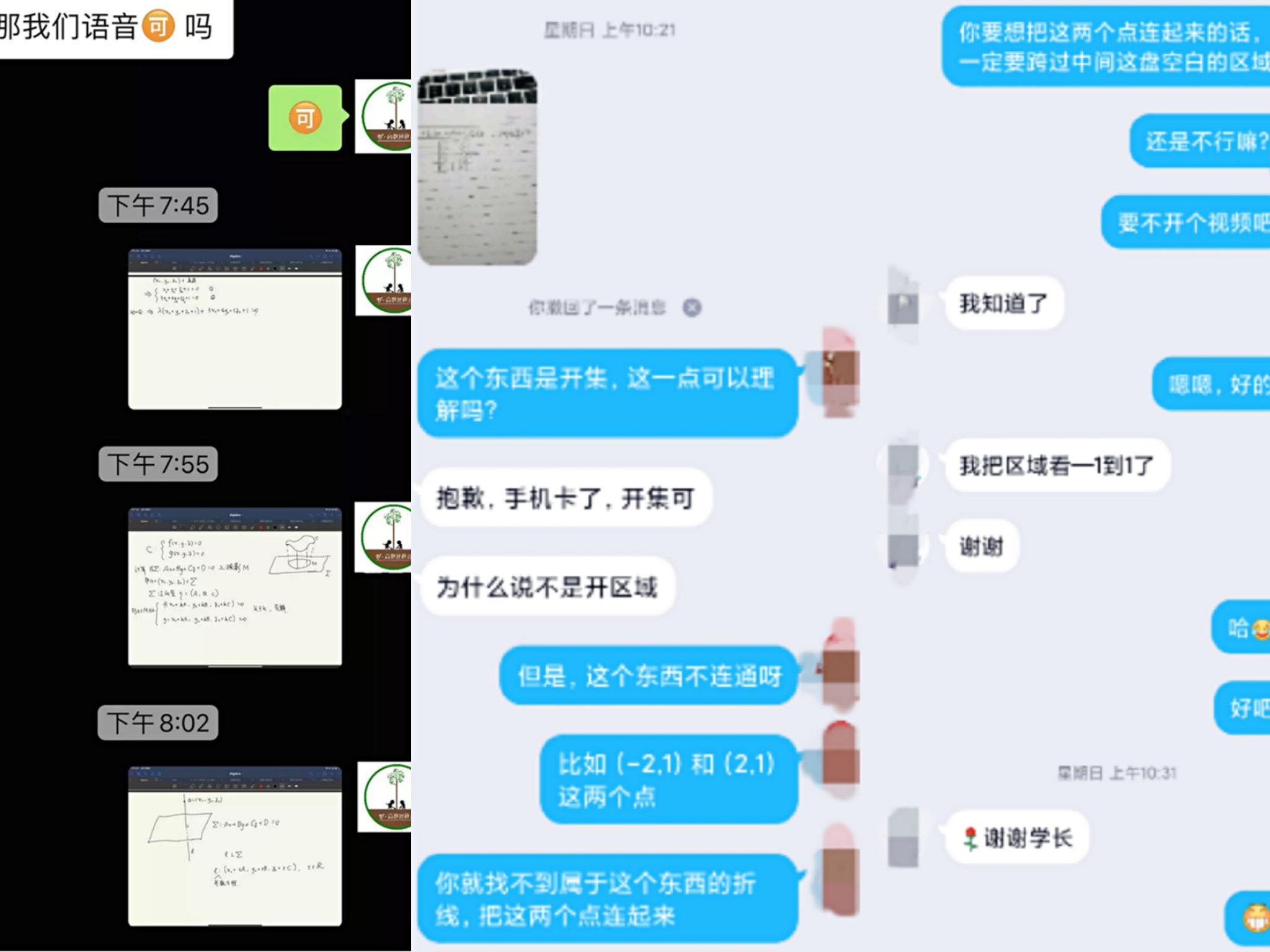 “数学学习邦”开始服务的消息一经发出便收到两校同学的积极提问。截至目前近半个月的服务时间内,平台收到了同学们在《高等数学》、《线性代数》、《复变函数》等数学课程学习中遇到的难题,涵盖了多元函数微分、重积分、空间解析几何和向量代数等内容。志愿者们根据提问者的需要,使用文字、语音、图片等各种形式,志愿者与提问者“一对一”连线,力图将题目讲好讲透。
