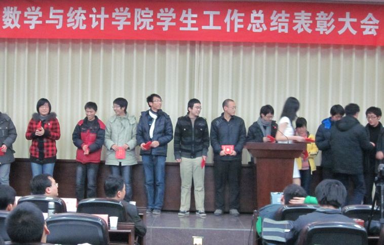 下一步学生工作提出了四点工作打算。大会进行到第三项,陈文艺、樊启斌副院长分别宣读了总结表彰文件,分别颁发了“数学学子特别奖”,优秀个人、优秀国防生和优秀学生寝室奖等,同时也对2010年优秀暑期社会实践小分队和“优秀青年志愿者”进行了表彰奖励。大会第四项,学院优秀社会实践小组成果展示,暑期优秀队伍分享了各自在外实践所取得的成果和经验。大会的最后一项则是考风考纪的宣传由院学习部代表来宣读考风考纪倡议书,号召同学们保持良好的考风考纪,保持和发扬爱情岛