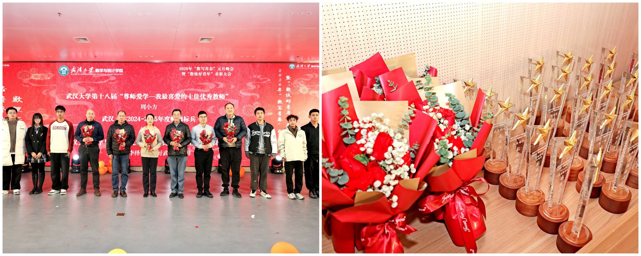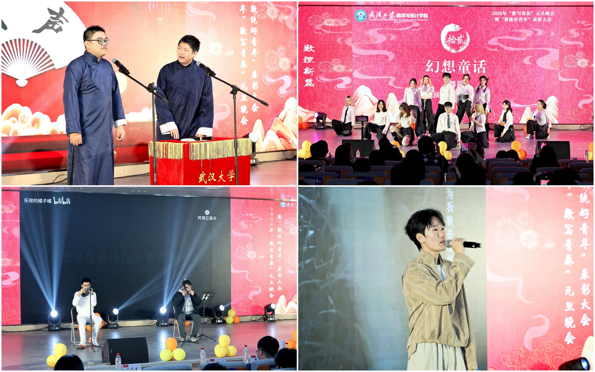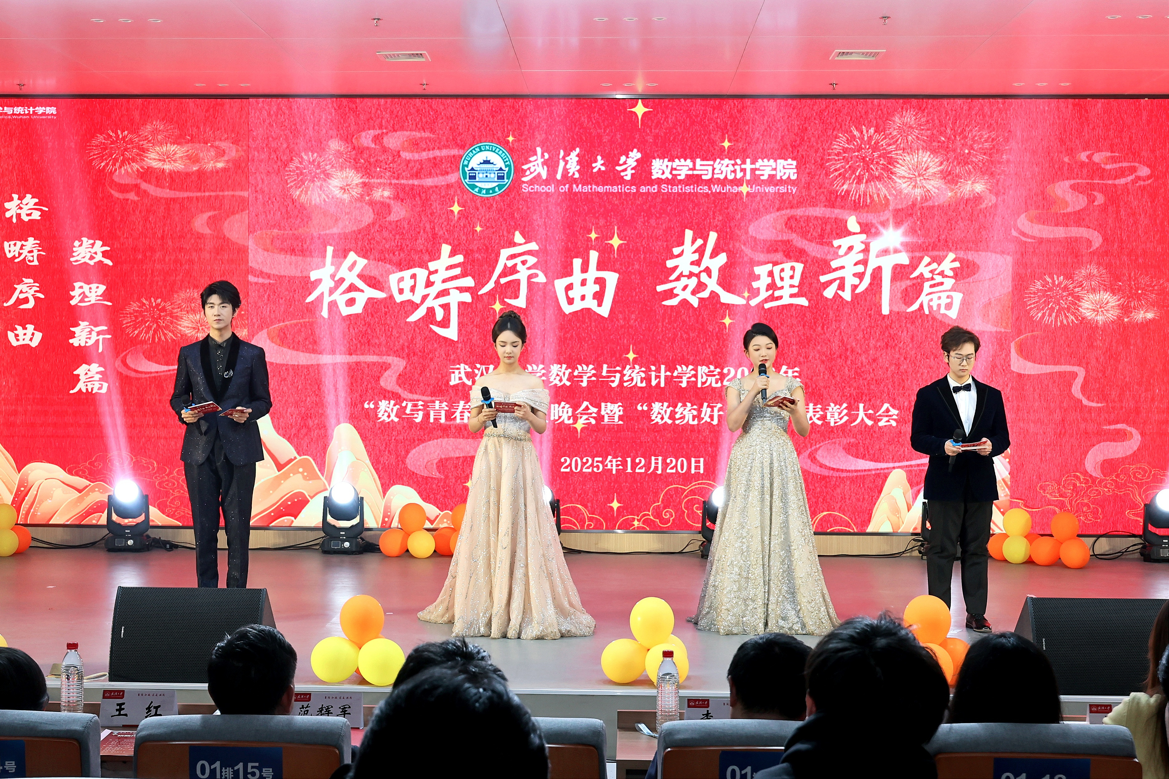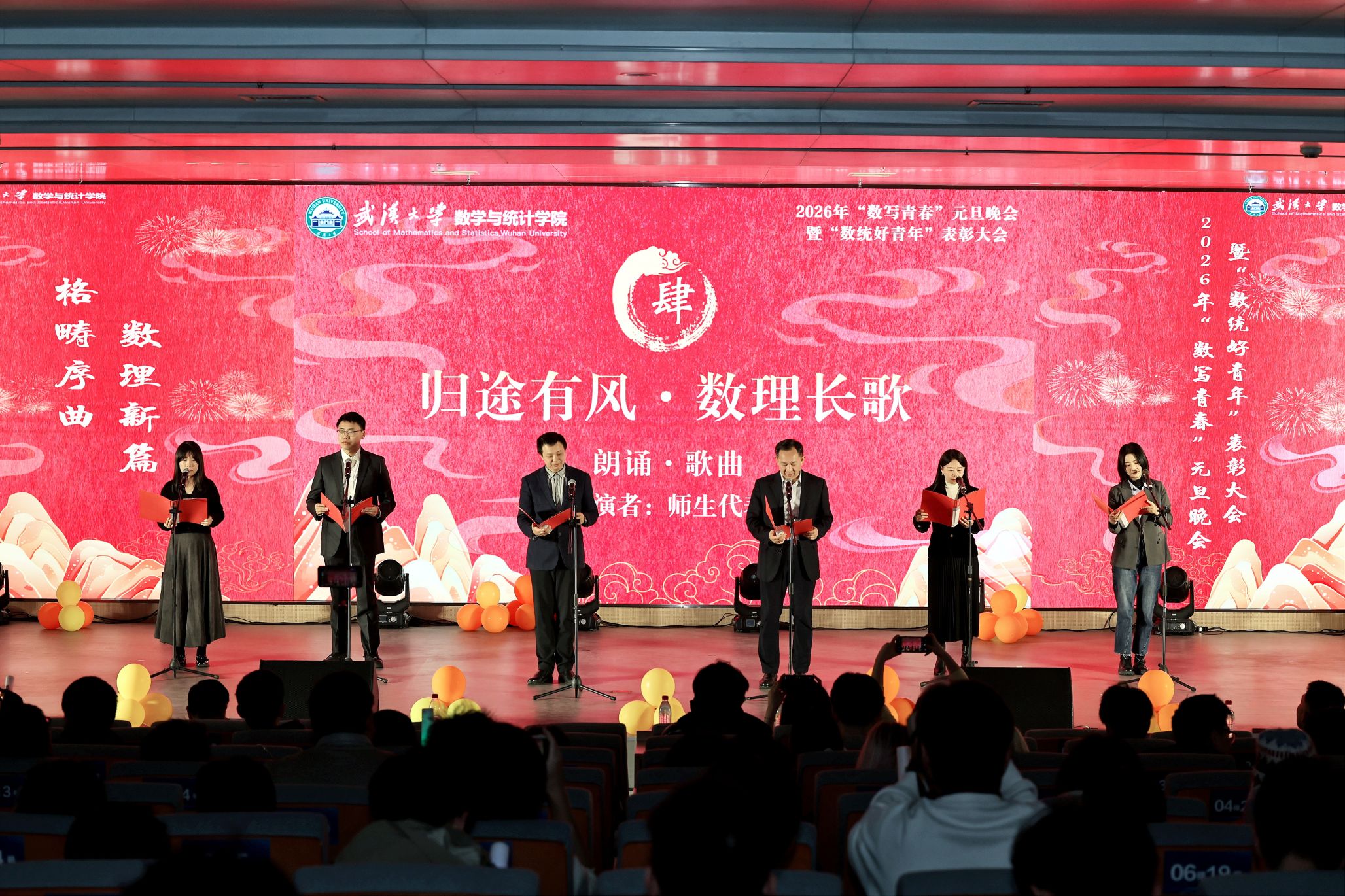 12�20日晚,我�2026年“数写青春”元旦晚会暨年度“数统好青年”表彰大会在雷军科技楼报告厅隆重举办。学校职能部门领导老师、学院党政领导、班级导师、行政教辅老师�300余名学生集聚于此,共同见证数学学院又一个收获的季节,迎接新年的到来�