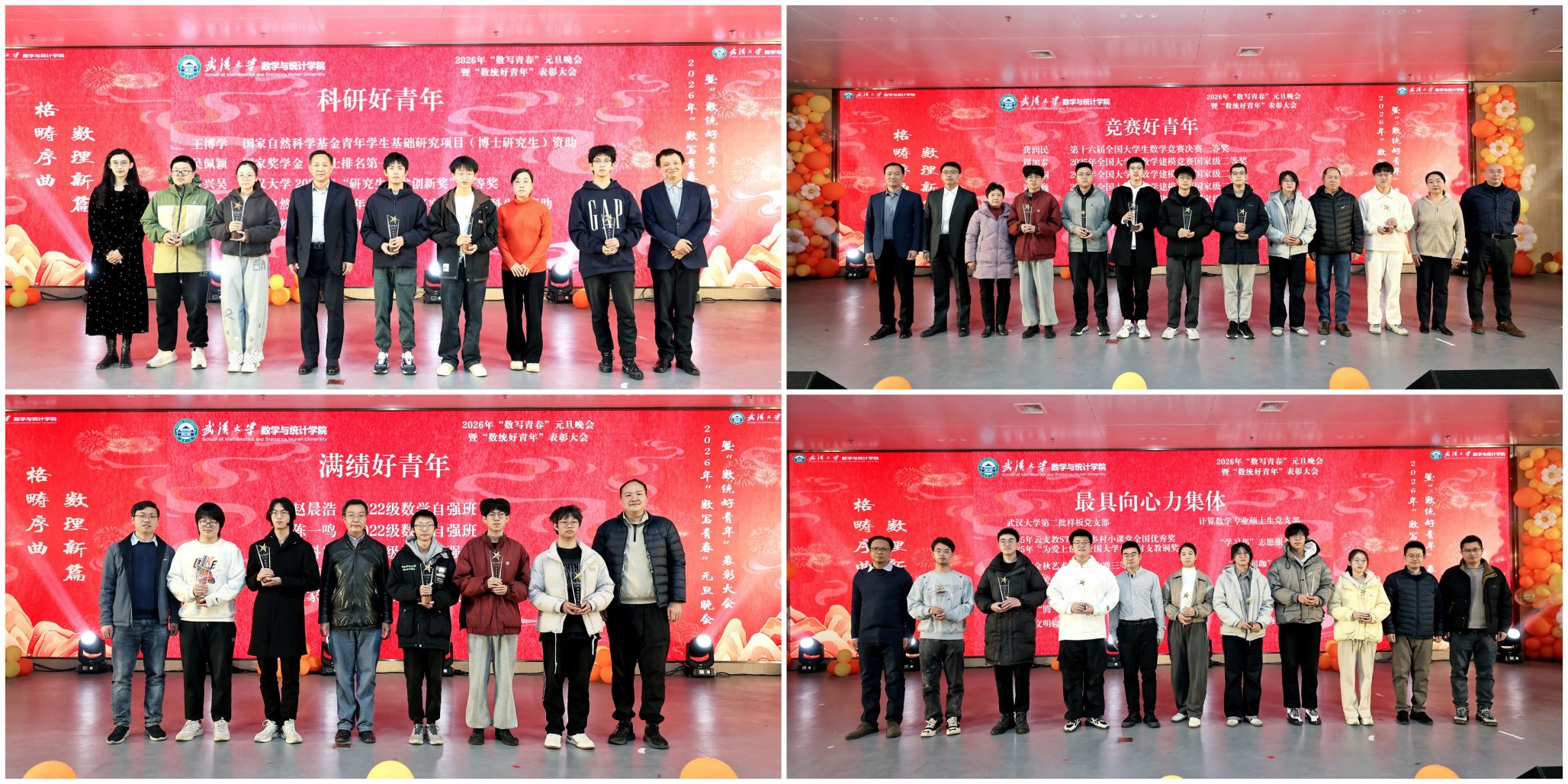 表彰环节,院领导及班级导师分别为“数统好青年”之科研好青年、竞赛好青年、满绩好青年及最具向心力集体颁奖。他们或是在科研领域潜心钻研、勇敢探索,或是在学科竞赛中奋力拼搏、追求卓越,或是在课程学习中精益求精、永不言弃,又或是在团队协作中无私付出、共克难题。这样的他们,以榜样力量激励更多同学向优秀看齐,以实际行动为学院增光添彩!