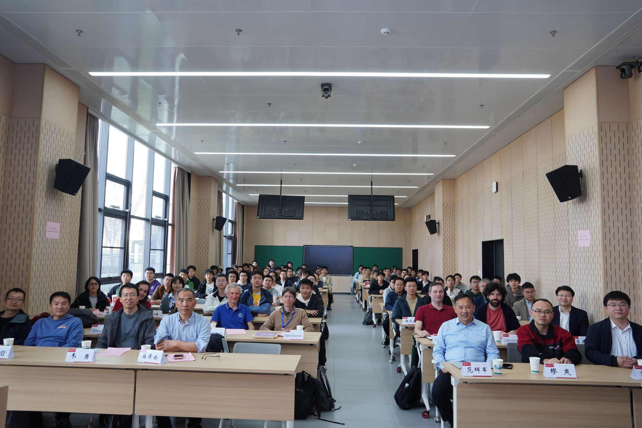 在专题报告环节,中国科学技术大学韦勇教授以“超曲面的几何曲率流及应用”为题首先介绍了经典的曲线收缩流,平均曲率流和高斯曲率流,以及其在证明等周不等式中的应用。之后介绍了逆平均曲率流,应用来证明凸几何中的Alexandrov-Fenchel不等式以及近年来几何流及应用方面的一些新的进展,为在场师生梳理了研究思路与方法,有效拓宽了青年学子的学术视野,激发了同学们对基础数学研究的兴趣与热情。随后,巴黎萨克雷大学Stephane Nonnenmacher教授作了题为“Geometry and spectrum of regular graphs”的学术报告。报告中,Stephane Nonnenmacher教授介绍了正则图谱分析的关键方法,探讨谱理论在正则图结构识别、同构判定、容错性分析中的应用,同时分享近年来正则图的几何与谱交叉研究的前沿进展,包括特殊类正则图(如强正则图、距离正则图)的谱刻画、谱技术在图嵌入、网络优化中的实践应用,为在场师生搭建了图论与线性代数、几何分析的交叉视角,助力青年学子拓宽学术视野、深化对组合几何与谱理论的理解。