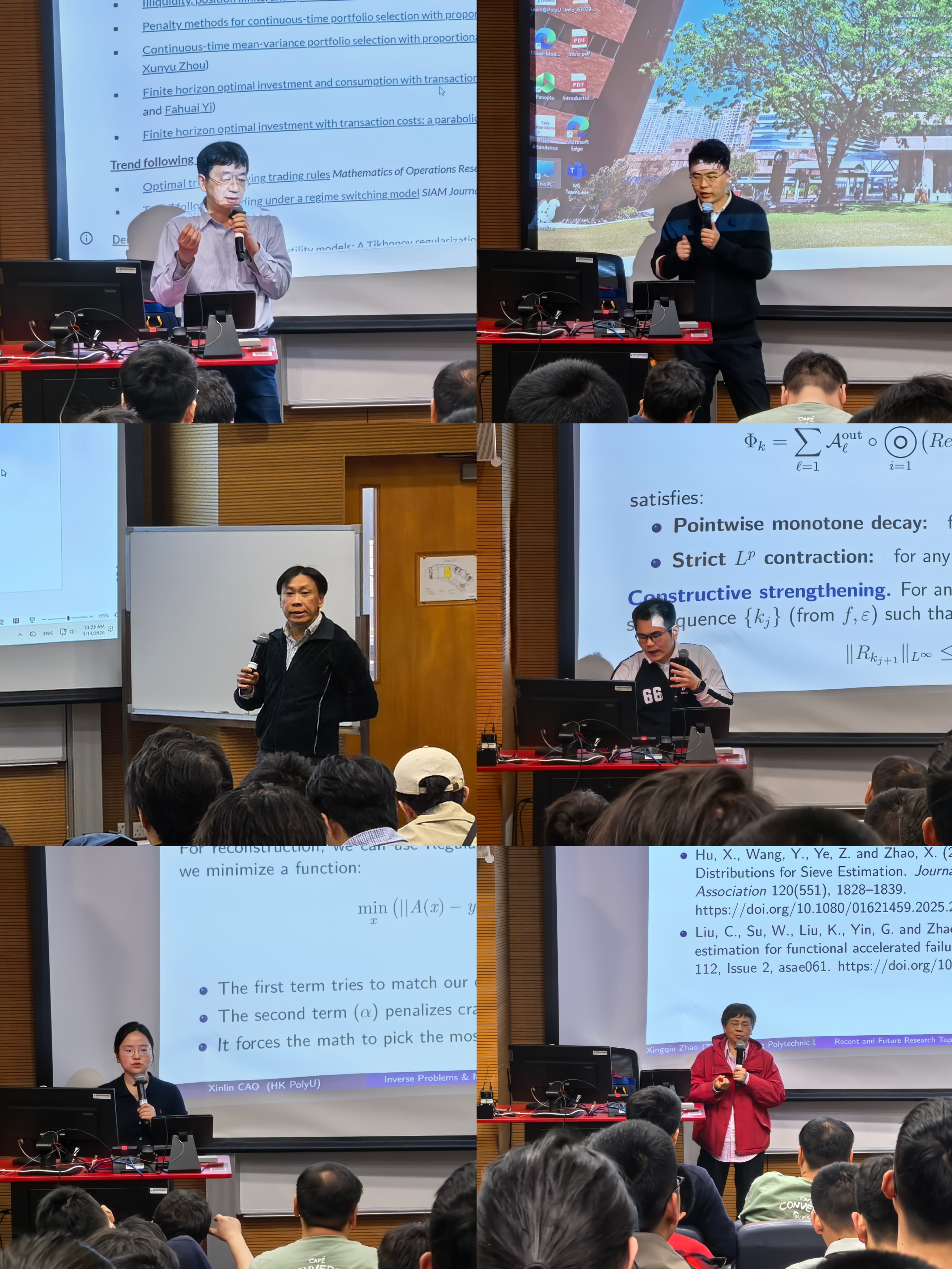 戴民教授围绕偏微分方程数值解与科学计算等前沿领域展开,结合博士与硕士研究课题,详细介绍了团队的研究方向,并分享了科研思维方法与团队协作经验。蒋招立教授介绍了其在量化投资等领域的研究方向,并通过具体案例讲解了动态决策难题背后的数学理论,阐述了从基础理论到交叉应用的多个方面。姚嘉晖教授围绕金融数学等交叉学科方向展开,结合具体研究课题分享了科研背后的思维方法,介绍了团队在相关领域的前沿研究成果。张仕俊教授介绍了其团队在应用数学前沿领域的研究成果,涵盖了相关方向的理论突破与实际应用,并针对课题选择提供了建议。曹鑫林教授围绕“数学反问题与材料科学”主题展开,介绍了唯一性、稳定性与重构三大要素,阐述了正则化方法及利用Helmholtz方程对波与材料相互作用的建模。赵兴球教授围绕“生存分析与深度学习应用”展示了团队在经典统计模型上的成果,并重点介绍了深度学习在风险推断、删失数据处理及纵向数据分析中的多种应用。