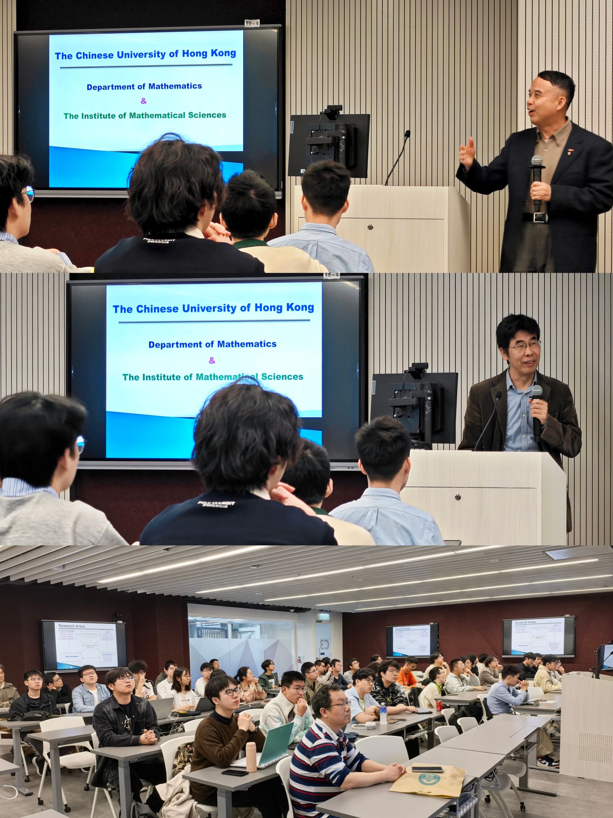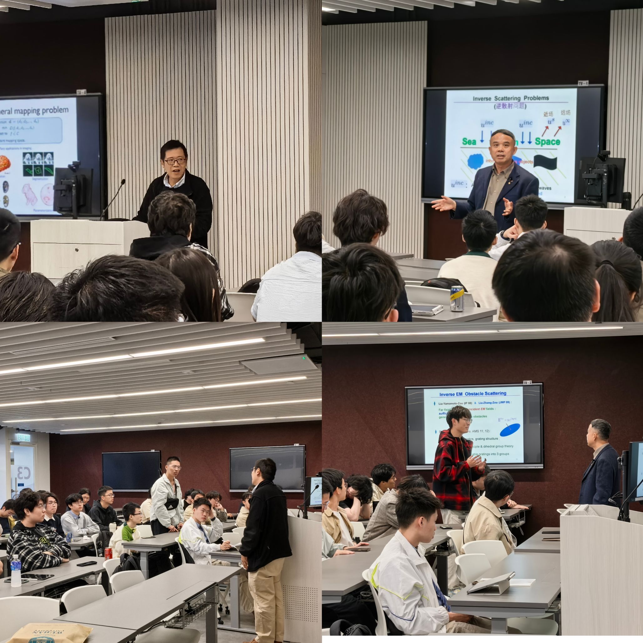 雷樂銘教授作题为《Quasiconformal Mappings and Constrained Mapping Problems》的学术报告。报告从约束映射问题出发,系统介绍了拟共形映射(Quasiconformal Mappings)的数学背景,并进一步展示了该理论在多个实际问题中的应用,包括大变形微分同胚配准、密度均衡映射以及折纸结构设计中的受限映射问题等。报告展示了几何分析方法在计算几何与图像处理等领域的重要应用。邹军教授作题为《Recent Theoretical & Numerical Developments in Inverse Scattering Problems》的报告。报告围绕反问题这一重要研究方向展开,介绍了该领域的理论背景与数值方法,并重点展示了香港中文大学在该领域近年来取得的重要研究成果。报告从理论分析与数值计算两个方面深入阐述了反问题在科学计算与工程应用中的重要意义。