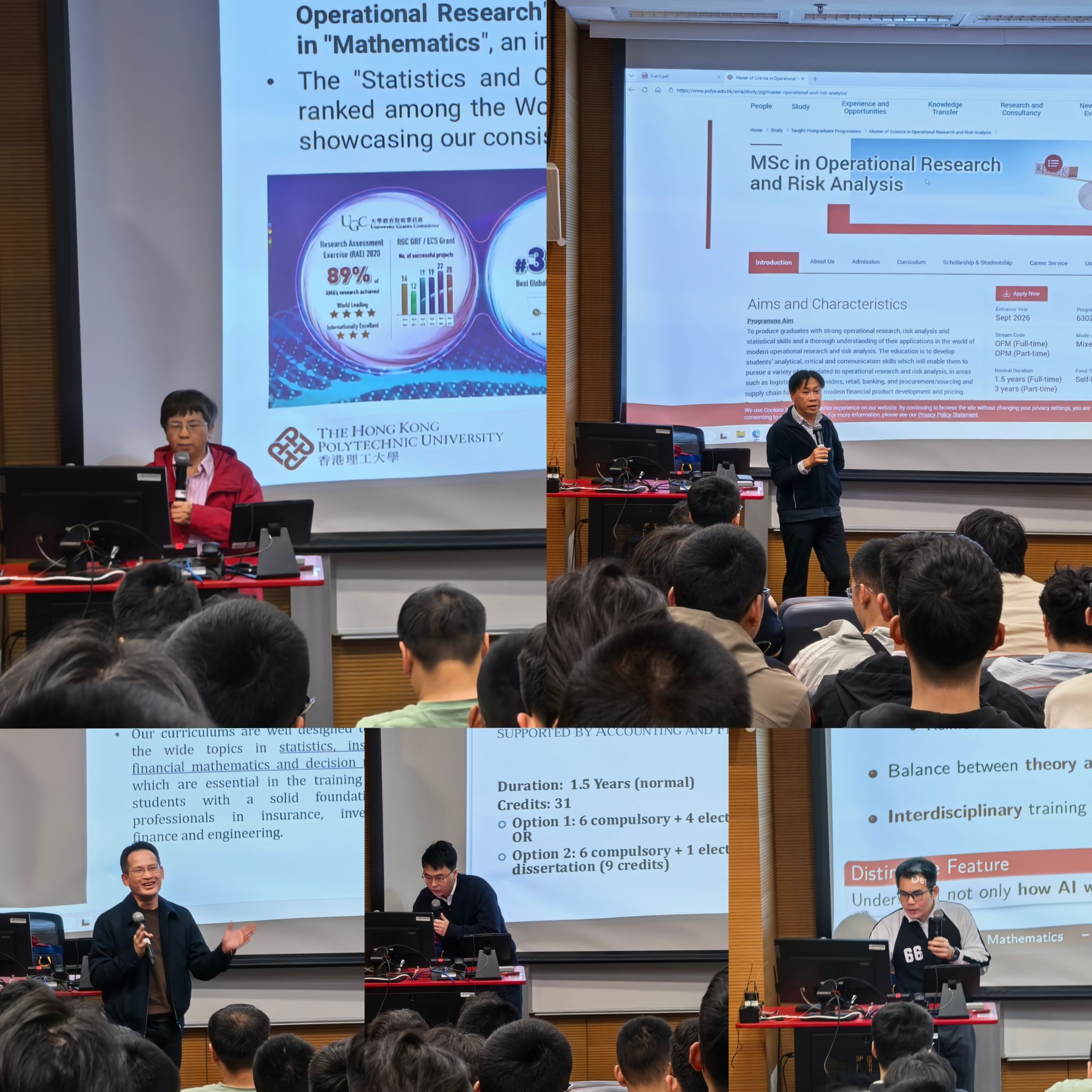 香港理工大学应用数学系副主任赵兴球教授首先代表香港理工大学及应用数学系致辞,对到场师生表示热烈欢迎,她详细介绍了香港理工大学的发展历程、校园特色及其在应用数学领域的卓越成就。此外,她重点介绍了应用数学系博士的招生要求和奖学金资助情况。楊翰強、姚嘉晖教授、蒋招立教授、张仕俊教授分别介绍了运筹及风险分析理学、精算与投资科学、量化金融与金融科技、数据科学与分析理学硕士项目,展示了学校国际化的培养模式以及广阔的学术平台。