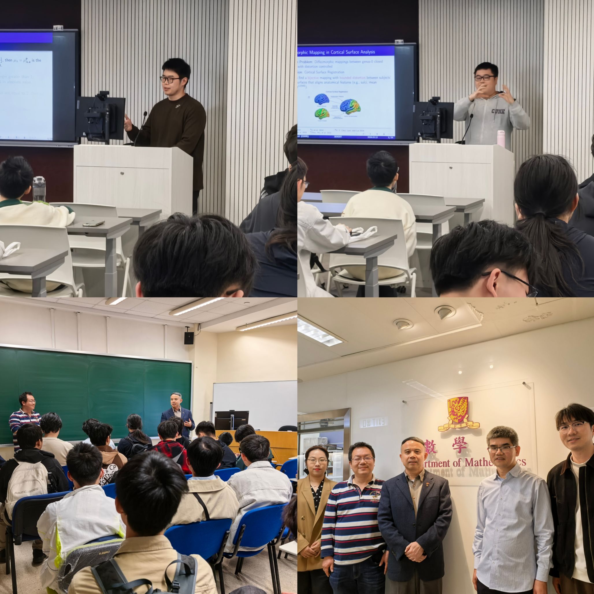 在学生报告环节,易天涵围绕《Homogeneous non-Rajchman self-similar measures on the line》,分享了自相似测度相关问题的研究进展与核心结论;许哲豪以《Two-chart Beltrami Optimization for Distortion-Controlled Spherical Bijection with Application to Brain Surface Registration》为题,详解了Beltrami优化方法在脑表面配准问题中的应用思路与实践成效。在自由交流环节,我院师生与香港中文大学数学系师生围绕个人研究方向、研究生培养模式、学术深造规划、未来合作契机等话题展开热烈讨论。同学们踊跃提问、主动交流,针对学术研究难点、升学备考细节、科研项目开展等问题虚心求教,教授与港中大学生耐心解答、悉心指导,现场氛围热烈融洽。