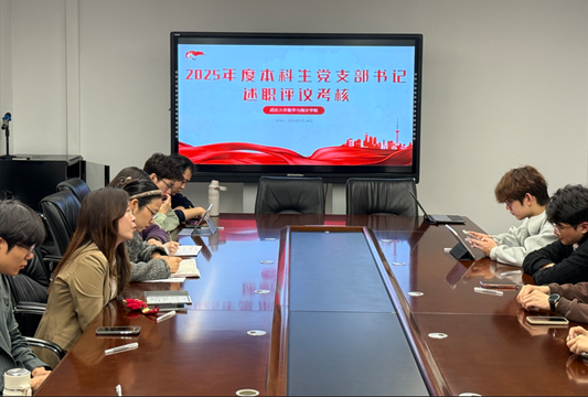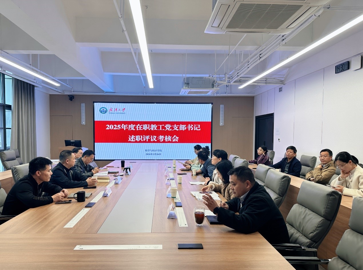刘晓春代表基础数学系党支部、雷玲代表应用数学系党支部、张继伟代表信息与计算科学系党支部、袁海丽代表概率与统计科学系党支部、周宁代表行政管理与实验教辅党支部、刘宇晖代表武汉数学与智能研究院党支部,分别对标“七个有力”标准,汇报了深入贯彻中央八项规定精神学习教育情况,梳理了2025年支部主要工作以及存在的不足,提出了2026年改进思路。述职结束后,与会人员现场进行了民主测评。