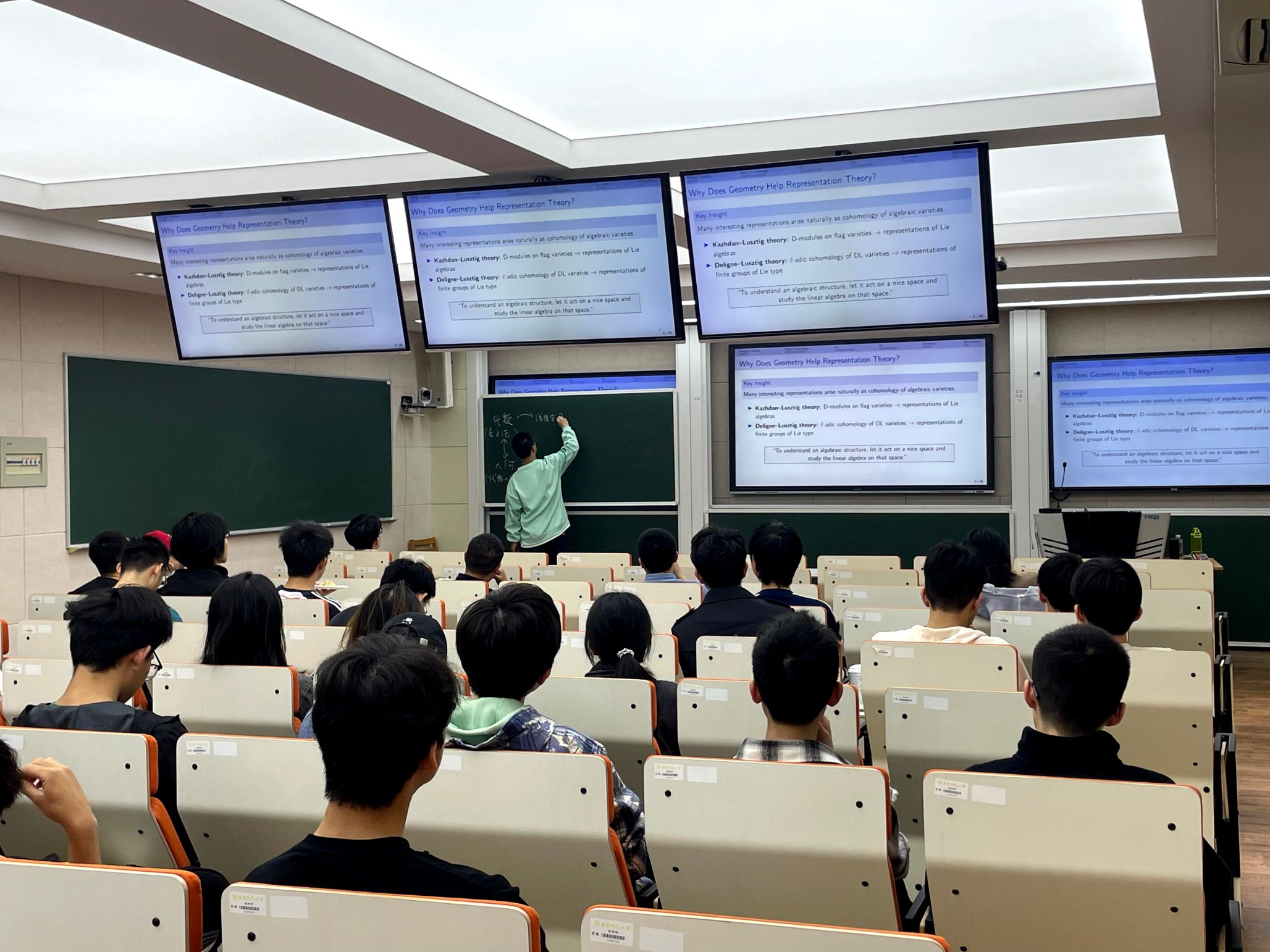 华东师范大学学生代表肖倍达以《几何与表示论的交叉应用》为题展开分享,从表示论基础概念出发,阐释几何与表示论的内在关联,介绍相关经典理论体系,并讲述数学家 Lusztig 在该领域的开创性贡献,展现代数几何与表示论交叉研究的前沿方向与深刻内涵。