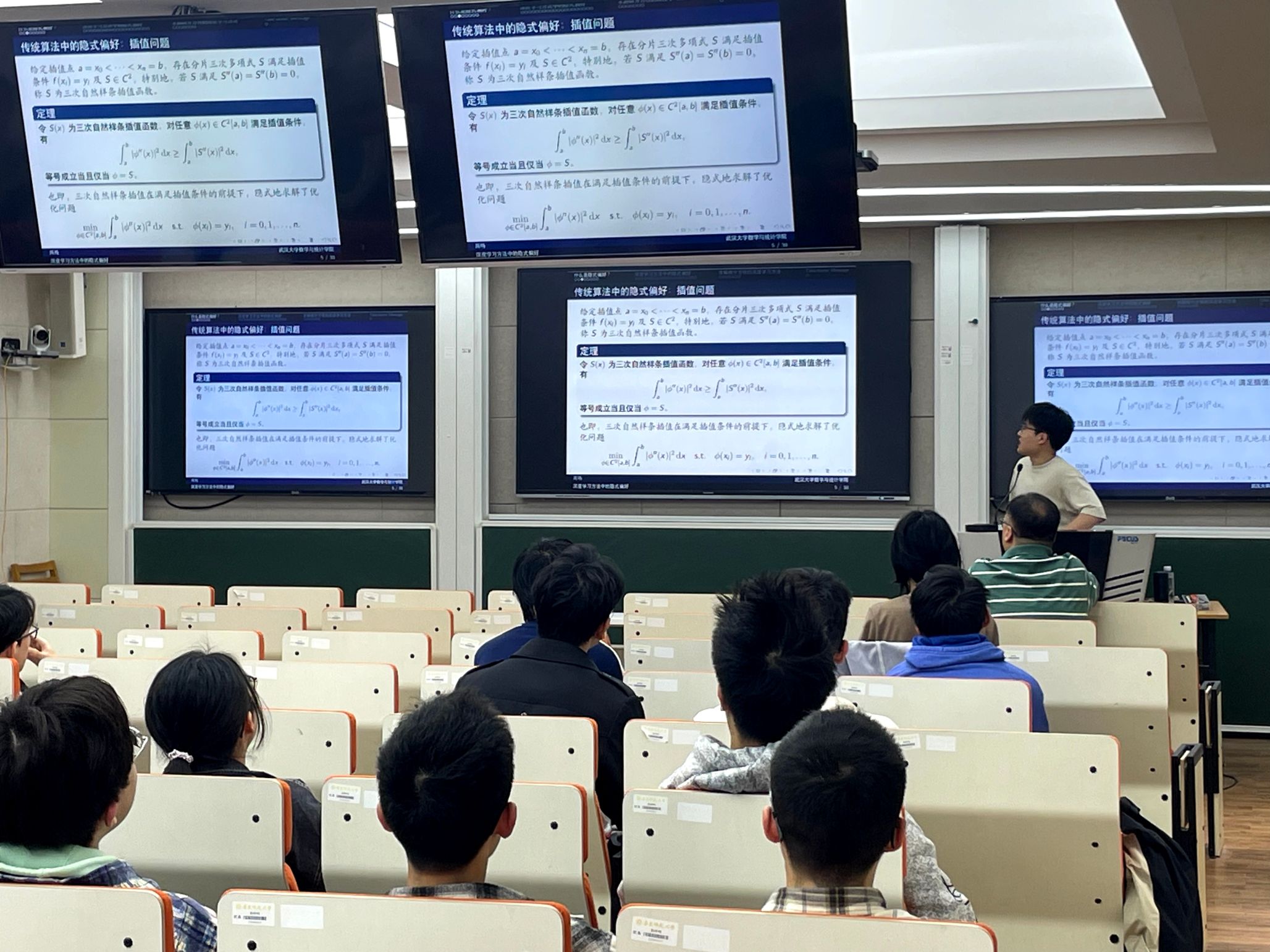 4月11日上午,交流团抵达华东师范大学闵行校区。9:30,学生专场交流在数学楼 401 报告厅正式开启。武汉大学学生代表周旸围绕《深度学习方法中的隐式偏差》带来学术分享,系统介绍了深度学习中的频率原则和凝聚现象,简要讨论基于深度学习的微分方程求解方法,展现了数学理论在深度学习与科学计算交叉领域的应用价值。