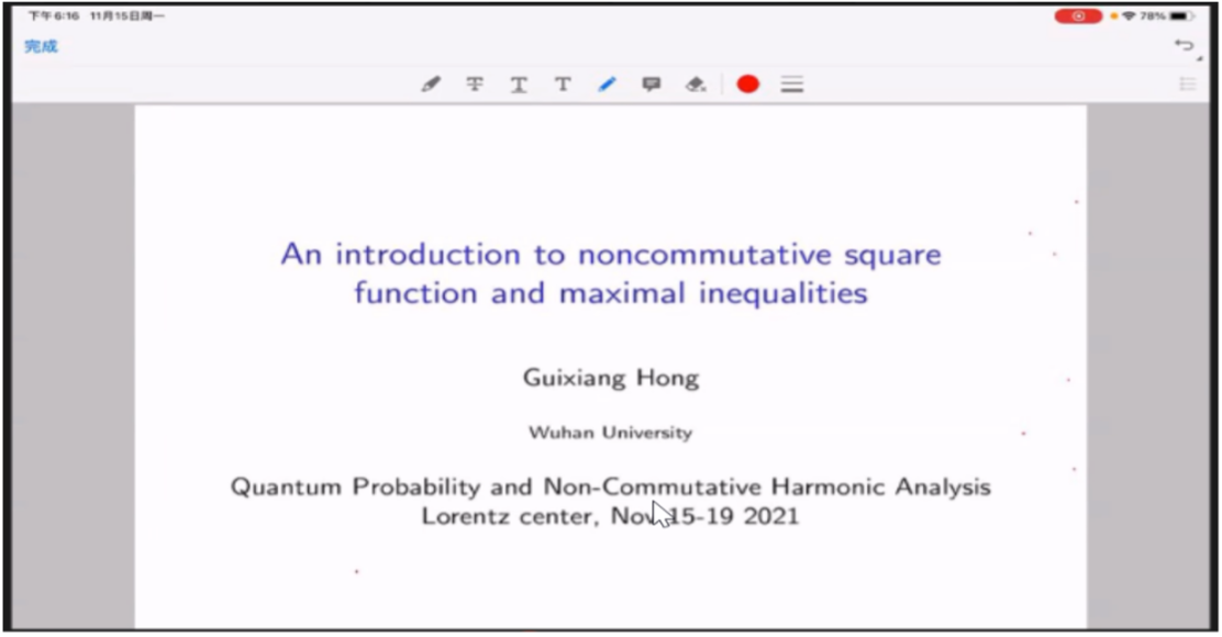 洪桂祥从经典Fourier分析中的Littlewood-Paley理论和Fourier级数的点态收敛问题出发,引出了非交换调和分析领域的核心科学问题。他介绍了非交换Lp空间理论、非交换平方函数与极大不等式的定义及基本性质,通过丰富例子阐明该领域的研究难点,系统介绍了研究意义及国际最新进展。他在报告中提及不少该研究领域的公开问题,引起与会者的浓厚兴趣与积极探讨。