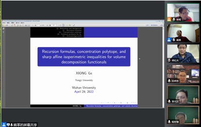 熊革教授介绍了其定义多面体体积分解泛函 (volume decomposition functional) 的动机和背景。其研究团队依据线性无关(linear independence) 和维数 (dimension), 把n维空间中多面体的体积 (volume) 这个基本的几何量分解成了n个n 次齐次多项式之和(Adv. Math., 389 (2021), 107902)。他解释了第 n个齐次多项式的研究意义和对Logarithmic Minkowski问题的推动作用,讲解了其研究团队解决3维空间中体积分解泛函极值问题的方法。熊革教授重点阐述了进一步研究高维体积分解泛函极值问题碰到的困难及解决方法,详细讲解了其研究团队最近证明的体积分解泛函的递归公式和对体积分解泛函定义域的刻画,尤其是涉及的集中多面体(concentration polytope) 的边界结构。最后,他介绍了如何用扰动的方法建立严格的仿射等周不等式。