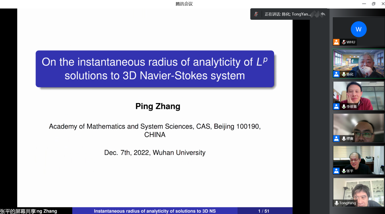讲学,在国家天元数学中部中心作题为“On the instantaneous radius of analyticity of Lp solutions to 3D Navier-Stokes system”的线上Colloquium学术报告。来自内地和香港地区的100多位专家学者线上参加。国家天元数学中部中心学术委员会副主任、爱情岛
