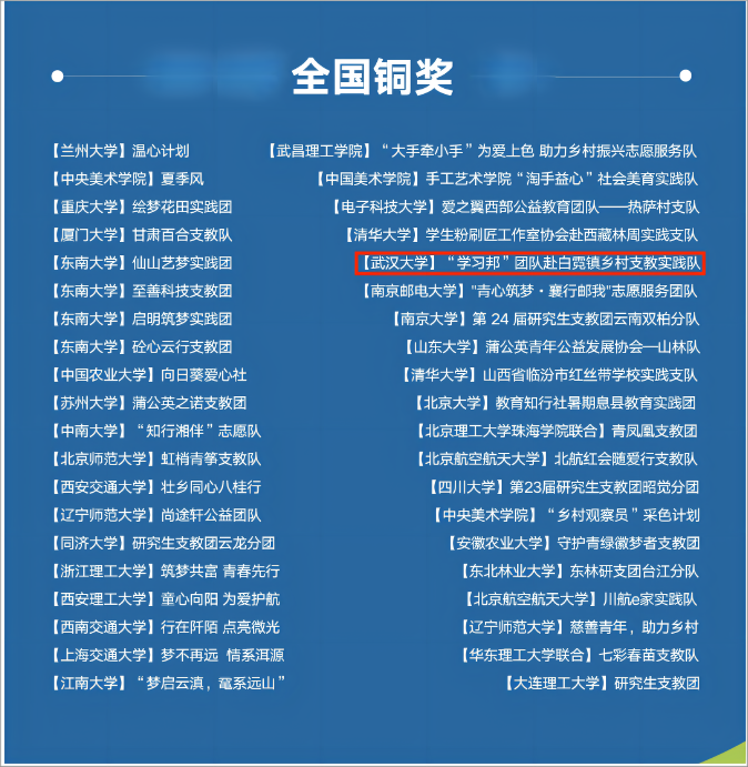 据悉,立邦「为爱上色」中国大学生农村支教奖于2017年设立,是团中央学校部“中国大学生知行促进计划”中的核心项目,五年累计支持全国144所高校�502支大学生团队�19071名大学生,完�12233天公益实践,影响人数超过2464万�第六届中国大学生农村支教奖共吸引164所高校�323支大学生团队申报�共计评�2个全国金奖�8个全国银奖�40个全国铜奖�“学习邦”支教队是我校入围上述奖项的唯一团队�
