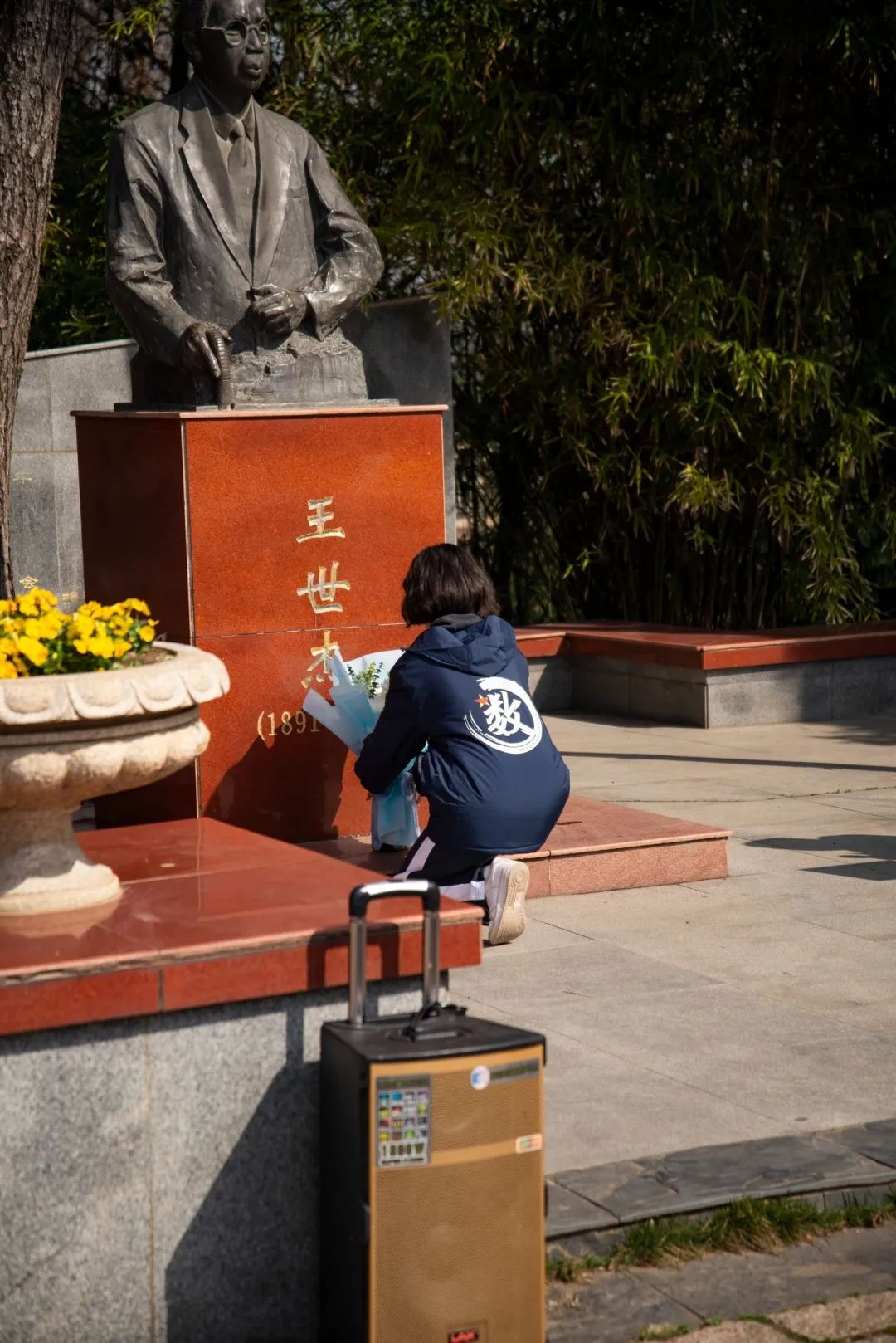 随后,青马班志愿者代表赵卓羲向王世杰老校�雕像献花�