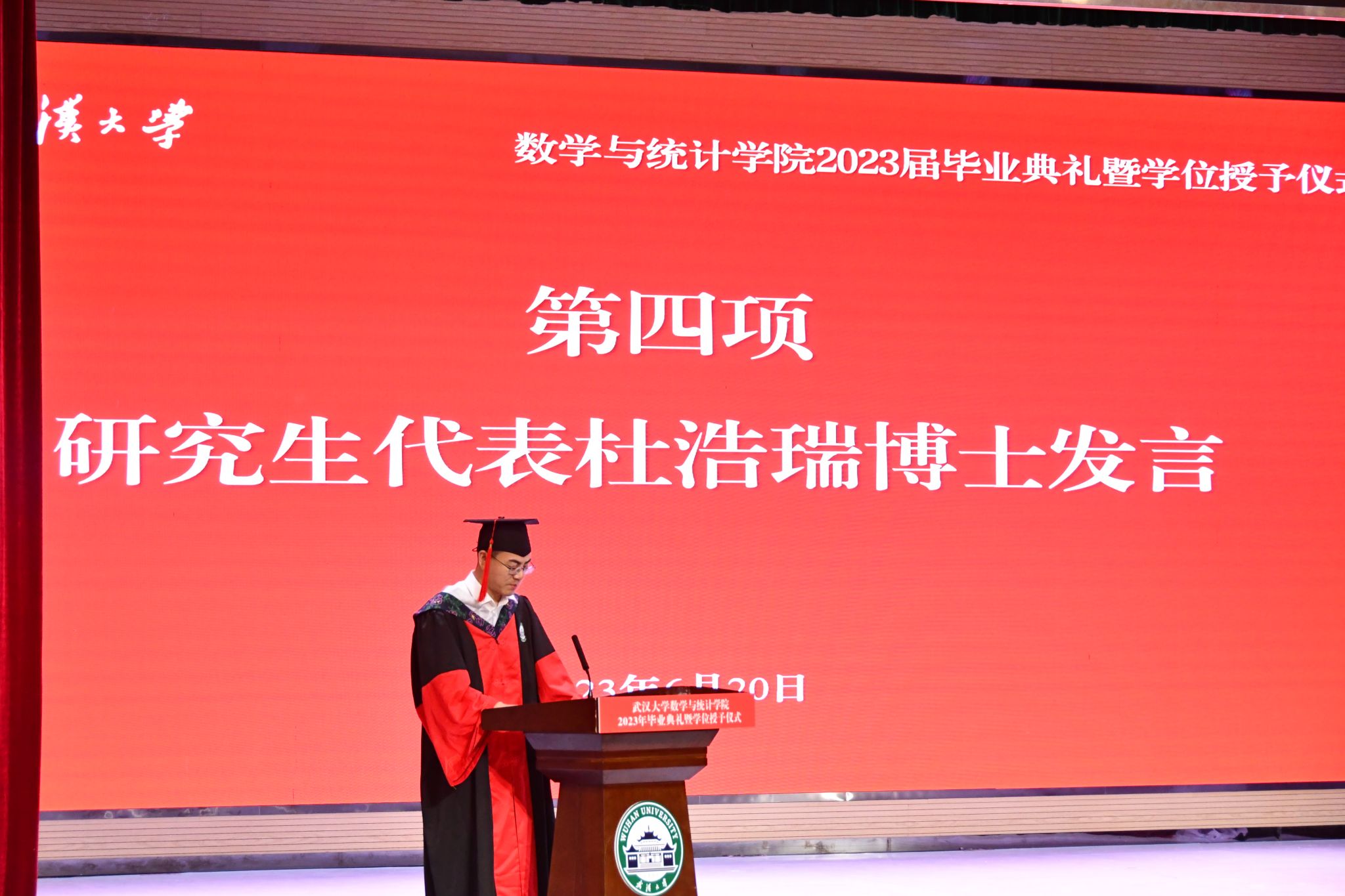 研究生代表杜浩瑞博士�发言�深情回忆了在读博期间的种种往事,表达了潜心科研、脚踏实地干事创业的初心以及对学院的深深感谢,并表示将继续奋斗,朝着自己的理想前进�