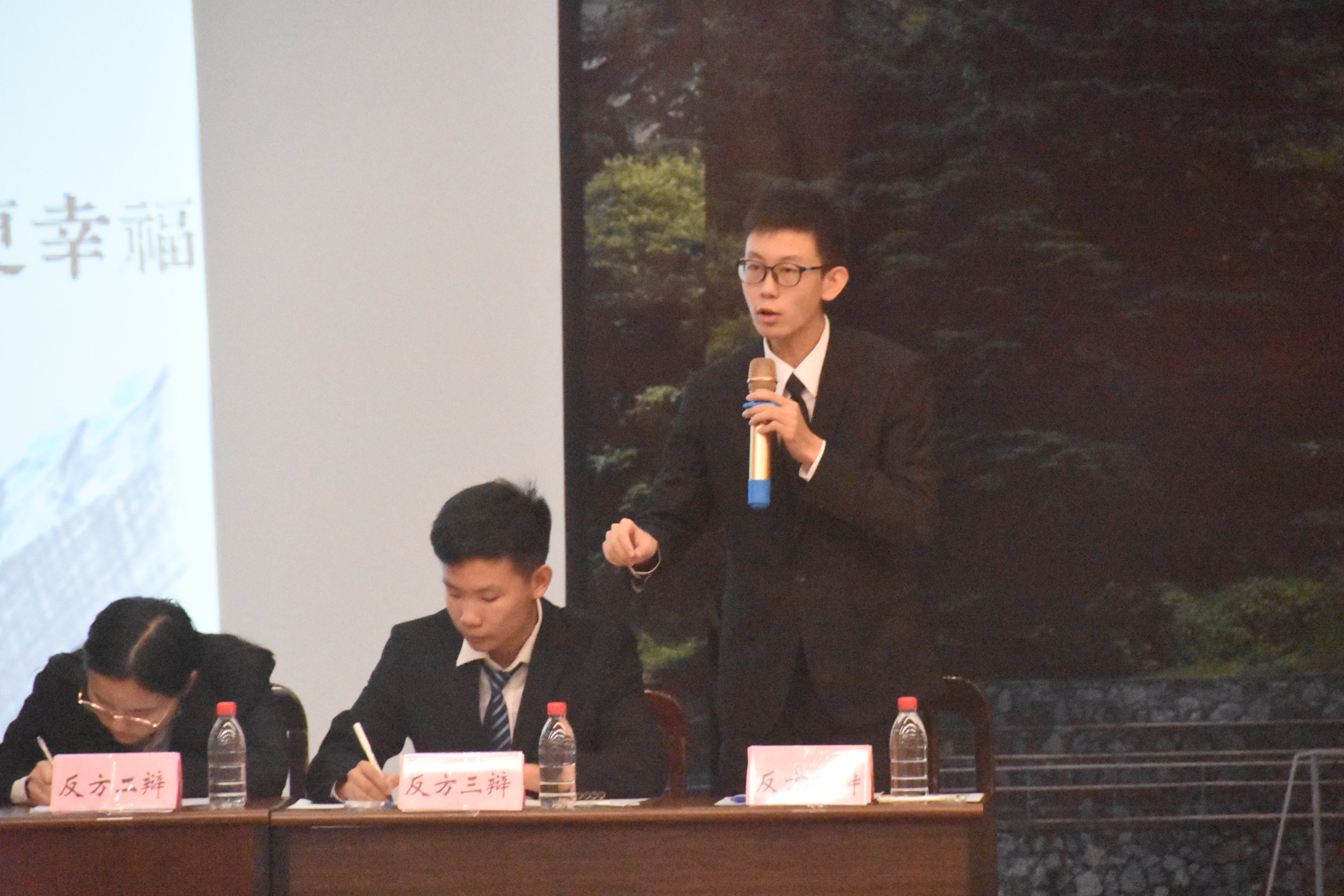 双方辩手可谓唇枪舌战、妙语连珠,他们旁征博引,将比赛带入了一个又一个的高潮。在一轮又一轮的驳辩与质询环节结束之后,我方三辩进行小结,不仅再次强调我方一辩立论,而且直击对方辩友的小结漏洞,赢得满堂喝彩!