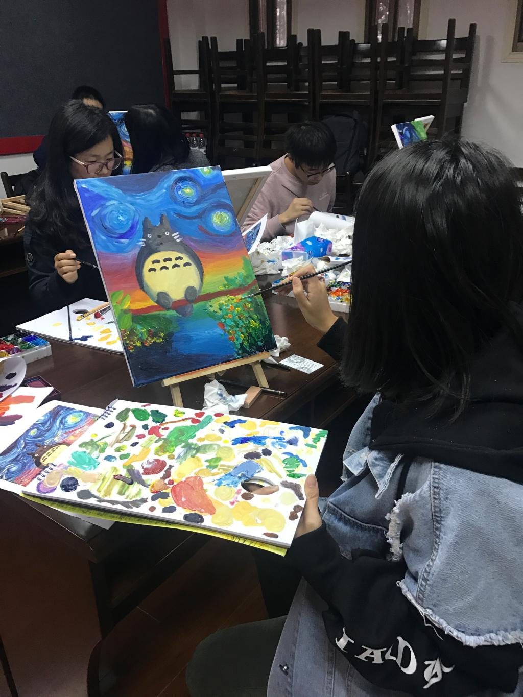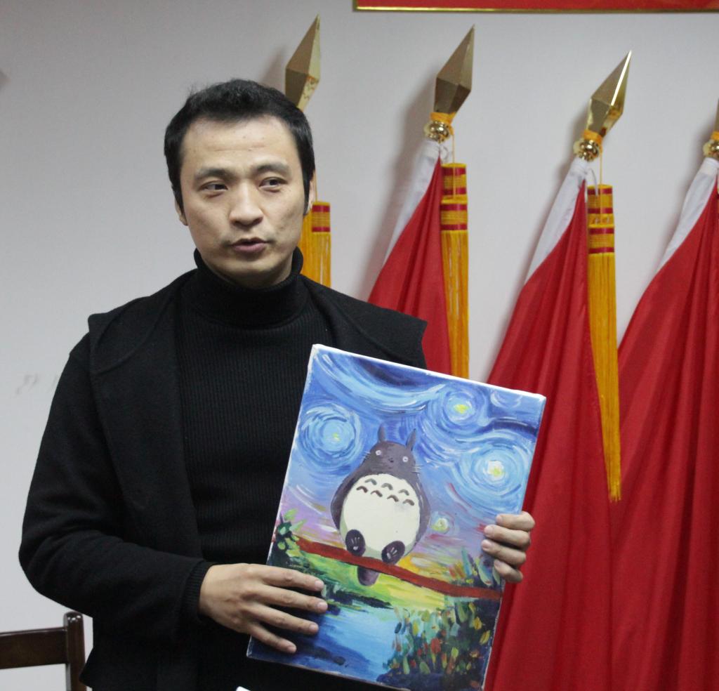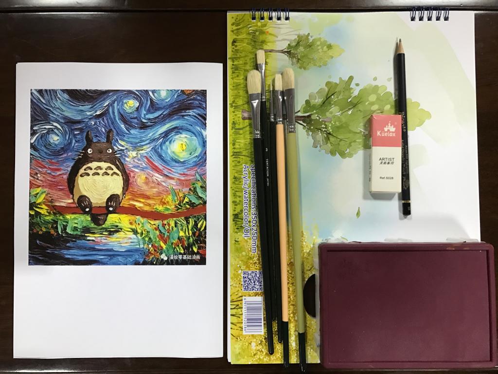 首先,小明老师为同学们讲解了选取龙猫这幅画的考虑——这幅油画色彩丰富,形象呆萌且为同学们所熟悉,非常适合初次接触绘画的同学进行临摹。然�老师为大家讲解了图中色彩的组成,并向同学们介绍了调色的原理,调色可以向两个方向调,一个是深浅度,一个是三原色的混合度�