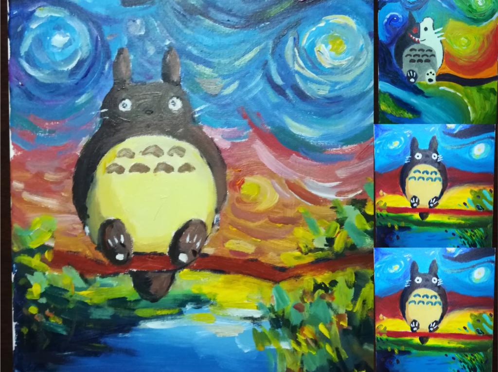 报名的同学大多是对绘画具有浓厚兴趣,所以真正拿起画笔开始绘画时,同学们显得有些兴奋。大家先用较为理性的方式将龙猫的大致轮廓用铅笔绘出,如通过对折纸张的方式找出龙猫在图中的位置,再以合适比例用铅笔将其草图勾勒。再用比较感性的思维为背景填充颜色,其中要注意颜色的深浅渐变,龙猫身上的阴影及细节。同学们在这过程中认真作画,乐在其中,并创作出了不少优秀的作品,下面我们一起来欣赏一下吧�