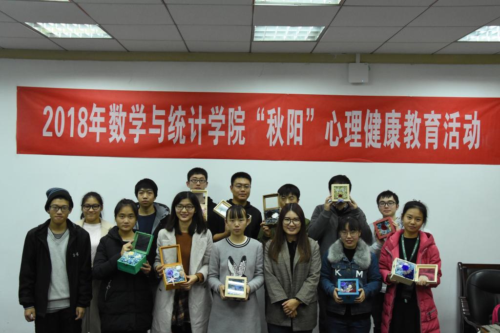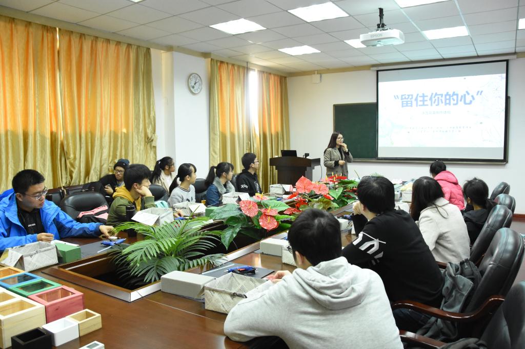 2018�11�24日下午两点,武汉大学数学与统计学院“巧手灵心”系列团体辅导第三期“留住你的心”永生花盒制作体验在学院三楼顺利举办。参与此次团辅的有学院心理辅导员方圆老师,工作人员随机抽取的10位同学,以及学院心理健康协会的工作人员�