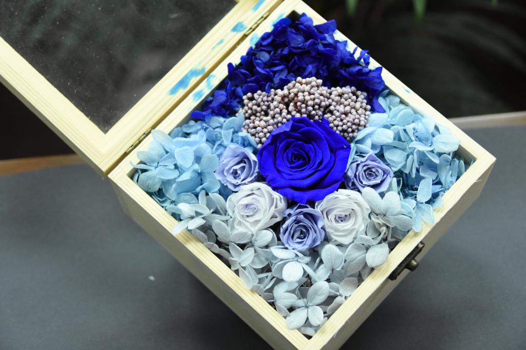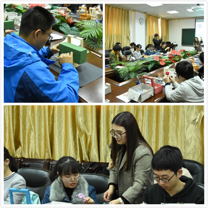 所有准备工作已经就绪,好戏正式开场!在方老师的带领之下,同学们首先将工作台上面准备好的花泥切割成合适的大小放入自己挑选的花盒之中,并用胶枪将花泥粘贴固定,至此,完美的底座便完成啦。接着,方老师示范了玫瑰花的两种制固定方法,以及如何固定花盒中的标配——绣球花。在同学们制作永生花盒的过程中,方老师一直在提供帮助,不仅随时解答他们的疑问,而且不断地提醒同学们要小心操作不要受伤。经过三个半小时的努力,每个人都制作出了自己专属的永生花盒!