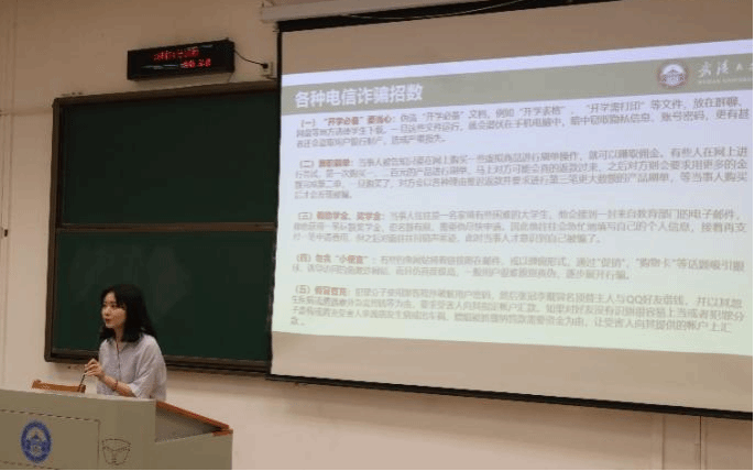 大会第一项由本科生辅导员廖蕾蕾进行安全教育。廖老师介绍了电信诈骗与校园贷的多种骗术与多重风险,并向大家详细介绍了学校提供的防电诈与校园贷的沉浸式微课学习的渠道与途径——星空班会:五个电话、小心“诈弹”。廖老师强调“安全问题是重中之重,请大家熟记于心。”
