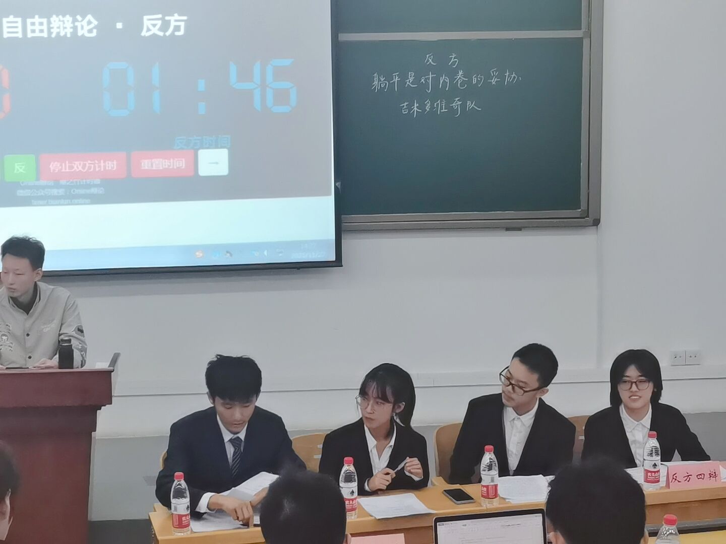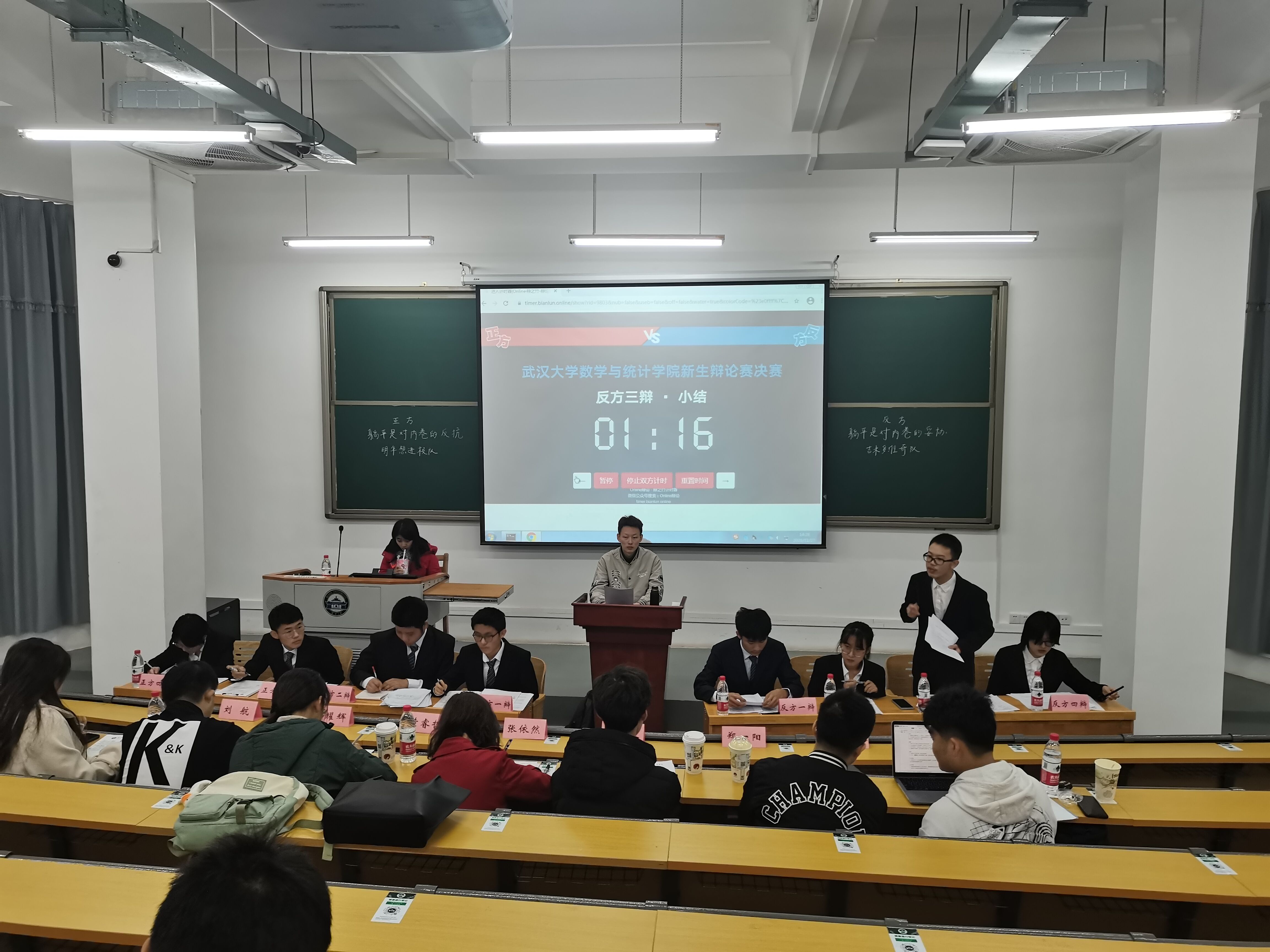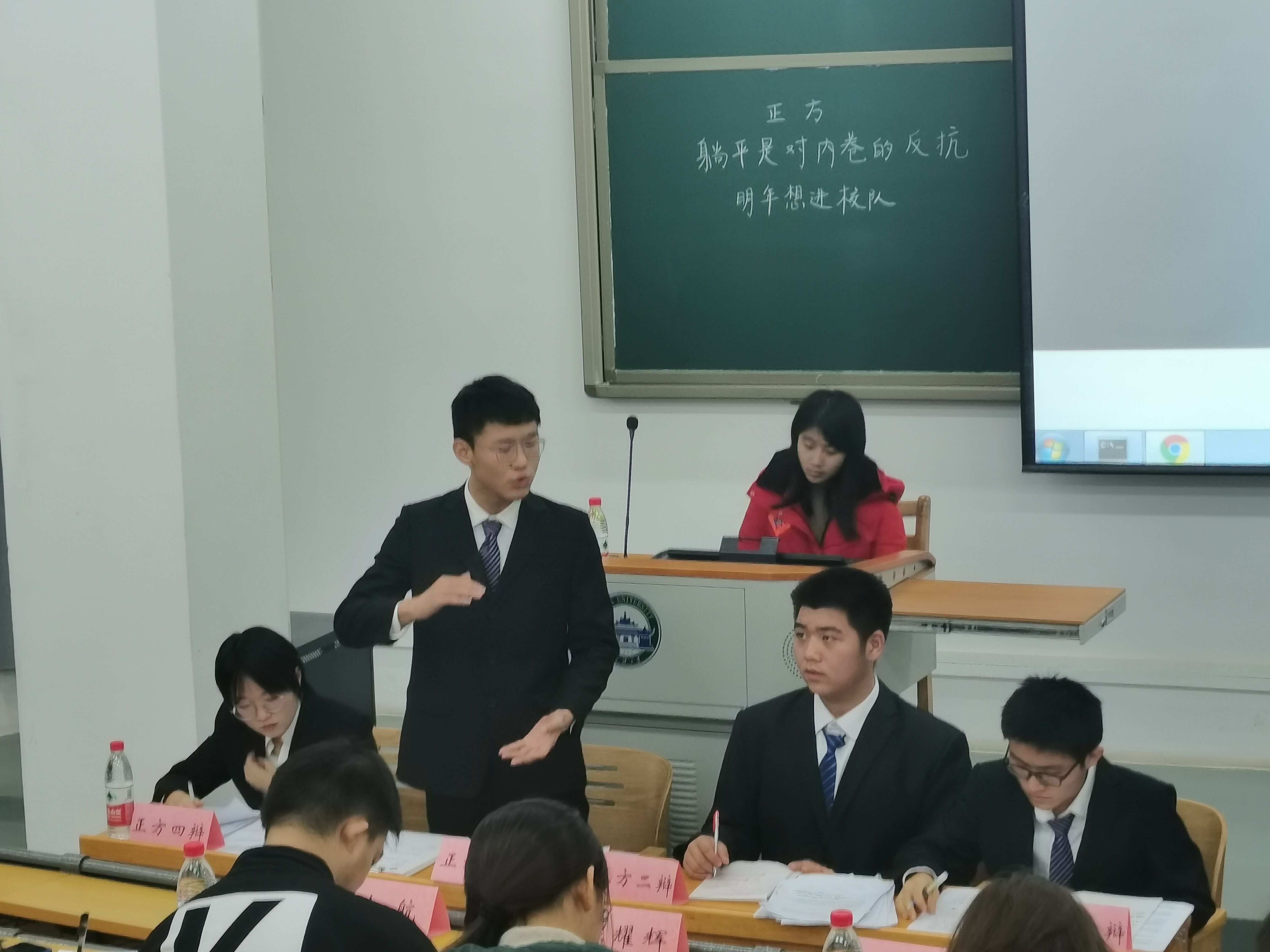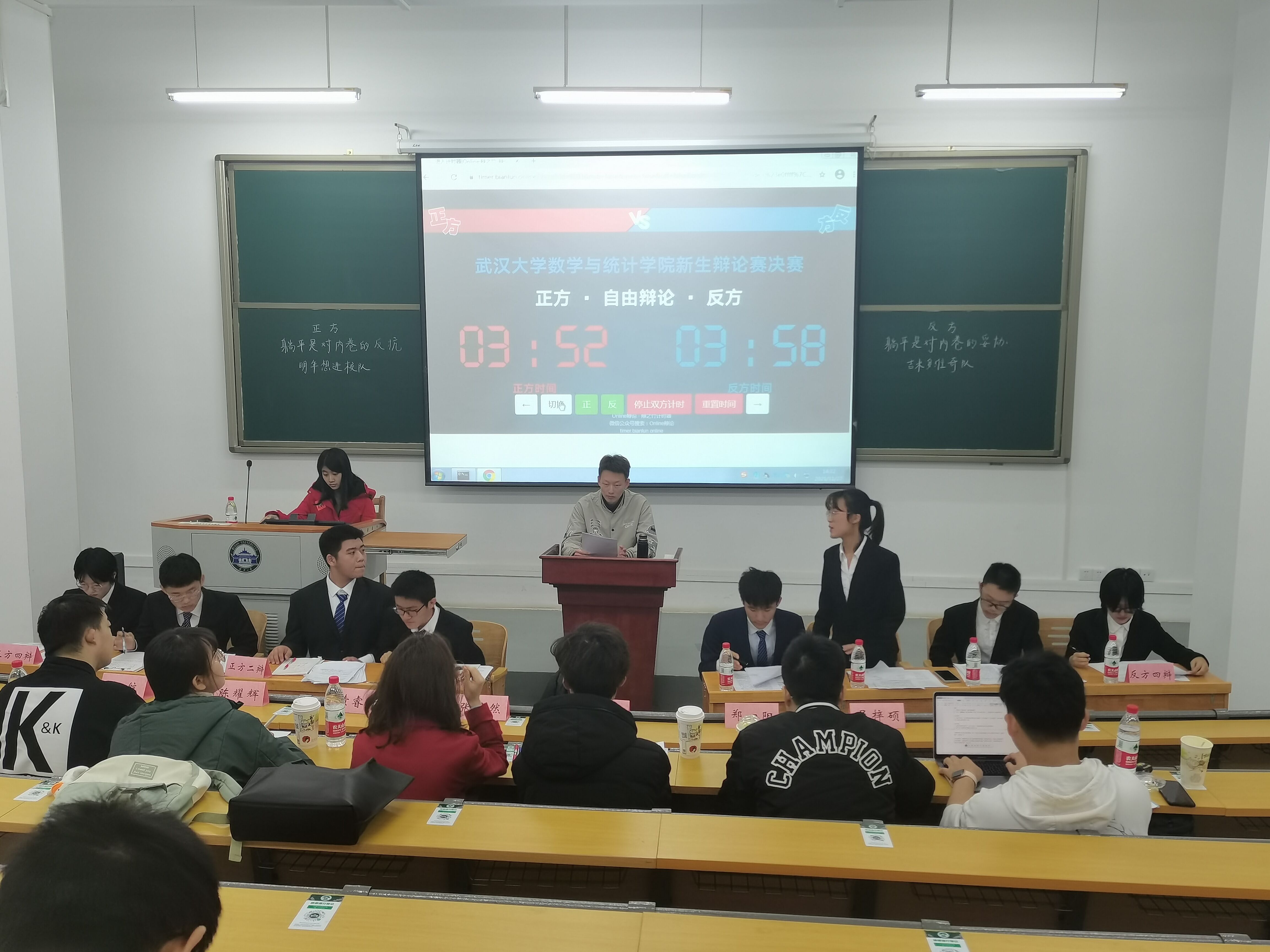 2021年新生辩论赛决赛于理学楼105教室正式举行。经过三个星期8支队伍32位新生辩手的激烈角逐,“明年想进校队”和“吉米多维奇队”一路过关斩将,在决赛场上展开巅峰对决。正反双方就辩题“躺平是对内卷的反抗/妥协”展开激烈论辩,正方“明年想进校队”的同学是来自21级三班的朱垚龙、郭德钏、佟佳泽和郭芷柔,反方“吉米多维奇队”的同学是来自21级二班的刘丰豪、杭子善、张爽和邹景雯。