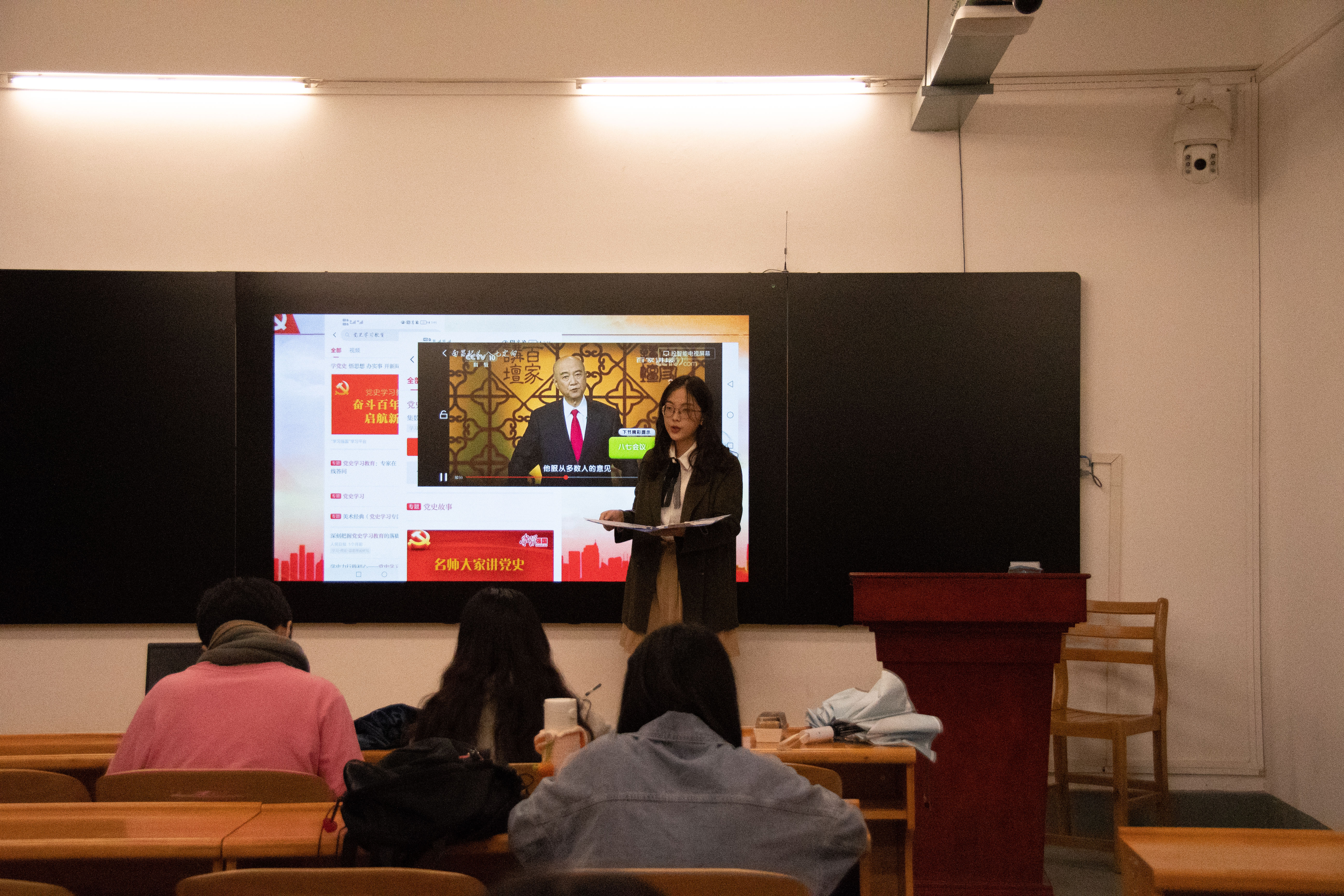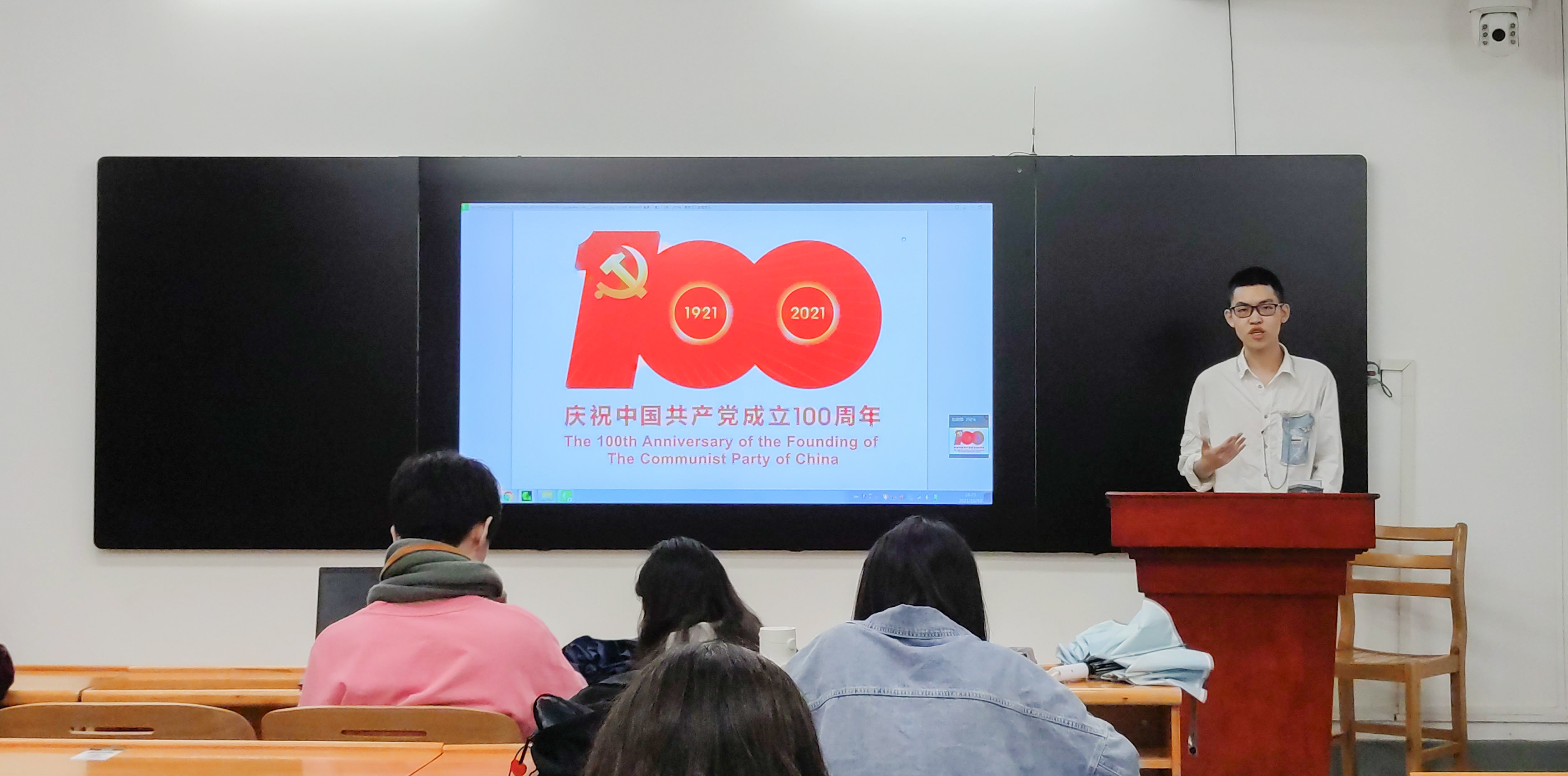 2019级统计班的胡哲是一位讲述百年党史故事的人:�在今天,在建党一百周年之际,我想作为一名讲故事的人,将曾经的故事分享给大家。有些火把在暴雪纷飞中熄灭了,有些星星在漫漫黑夜中湮没了,有些人在革命胜利前夕倒下了。我今天站在这里,是为了我的高祖父,为了许继慎、吴焕先,为了千千万万个没能等到光明的英烈们,希望你们能多记住他们一些,哪怕是一点点��