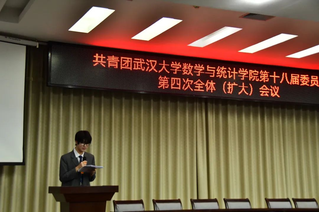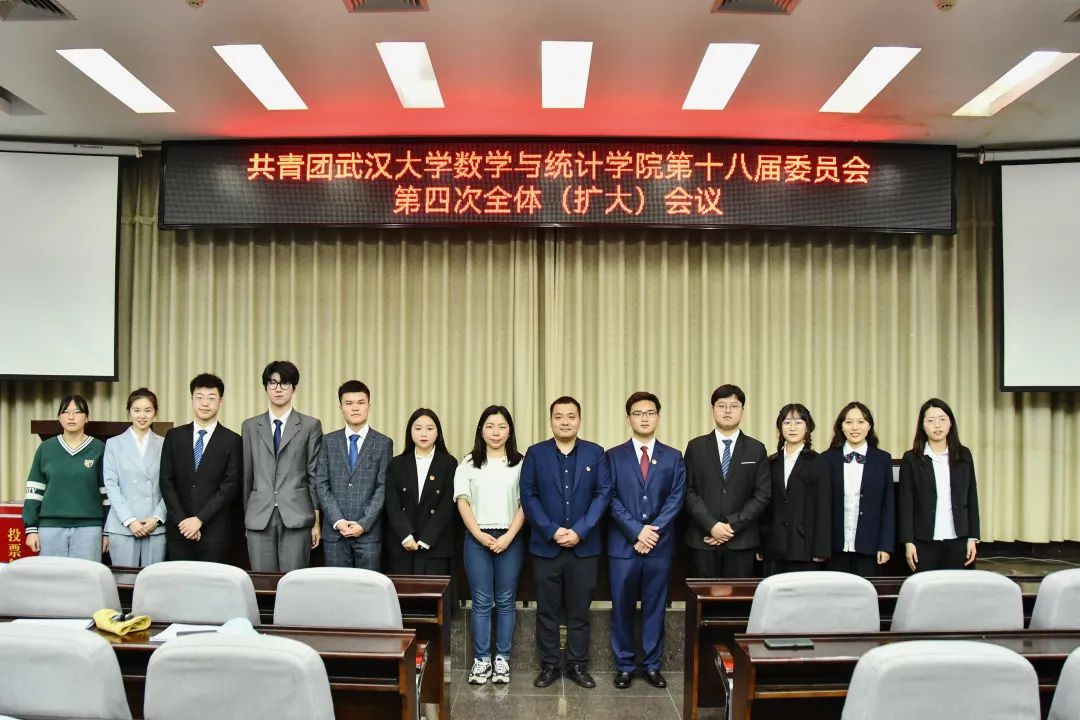 2022�5�19日,共青团武汉大学数学与统计学院第十八届委员会第四次全体(扩大)会议于学院数学会堂正式召开。与会人员有,学院团委书记刘宇晖、院第十八届团委委员以及各团支部书记。本次会议由院十八届第二任期学生团委副书记刘傲然主持�