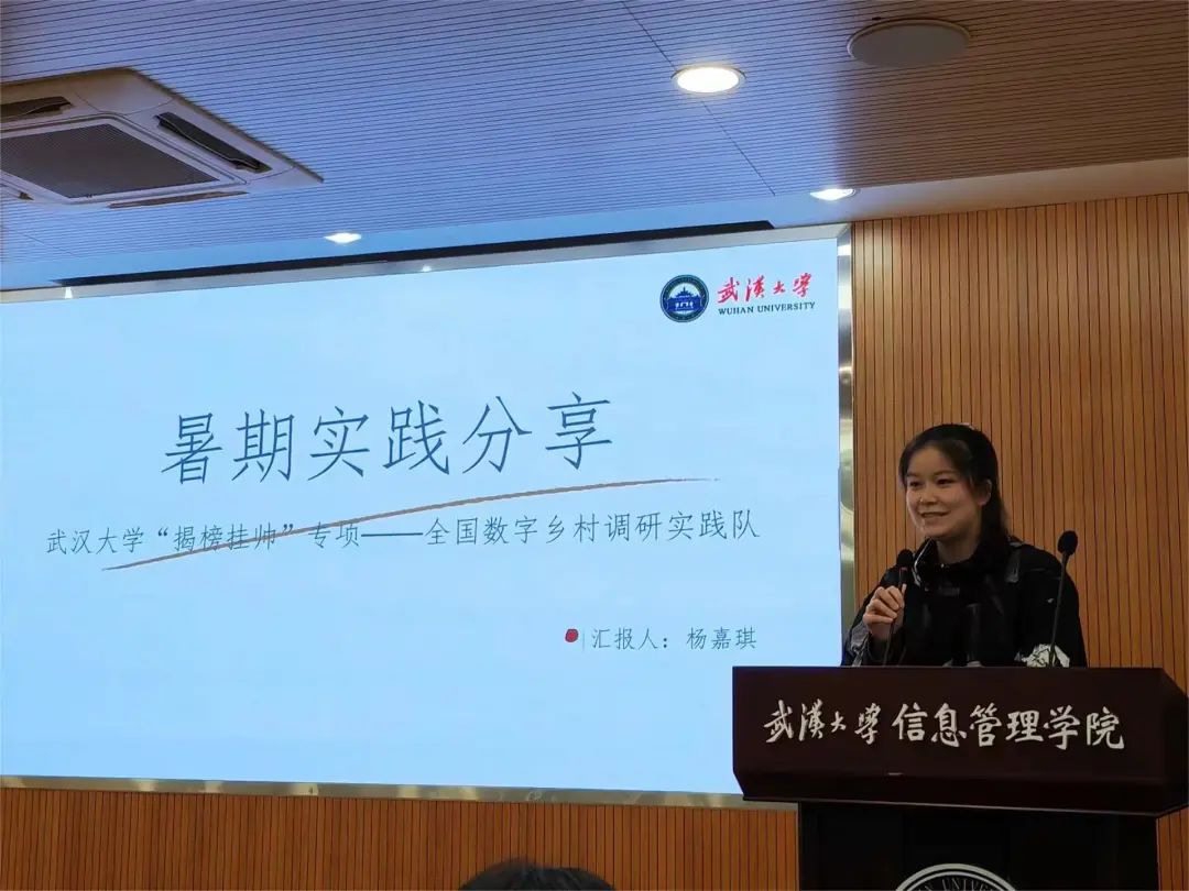 最后进行分享的是来�“武汉大学‘揭榜挂帅’专项——全国数字乡村调研实践队”的杨嘉琪同学。杨嘉琪同学所在的团队包含来自全校14个不同院系的59名本硕博同学,如此大的团队规模需要仔细分工,如通过将整个实践队分为若干小队,确保任务落实到每一个人。就如何调动众多成员的积极性这一问题,杨嘉琪同学也给出了自己的解决方案——通过详细记录各个成员的贡献值形成榜单,按团队贡献度进行名单排序,激励团队成员完成实践任务�