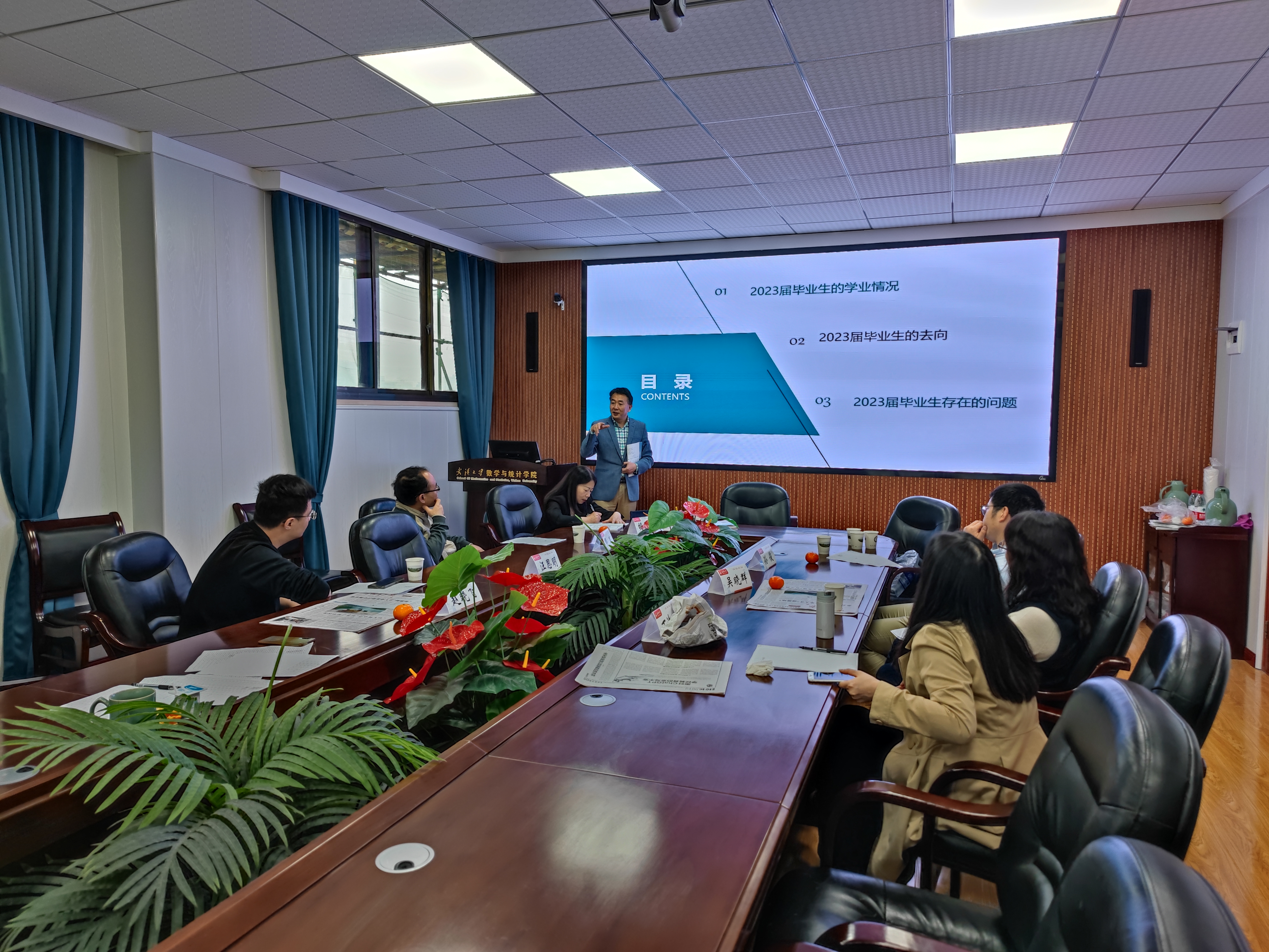 胡法拉先从整体上介绍了2023届毕业生的学业、就业等方面的情况以及存在的问题,然后逐一介绍了6个毕业班学生的考研情况、申请出国留学情况、就业情况和待就业的学生名单,重点分析了待就业学生的现状。胡雪红介绍了学生毕业论文进展情况以及存在的问题。