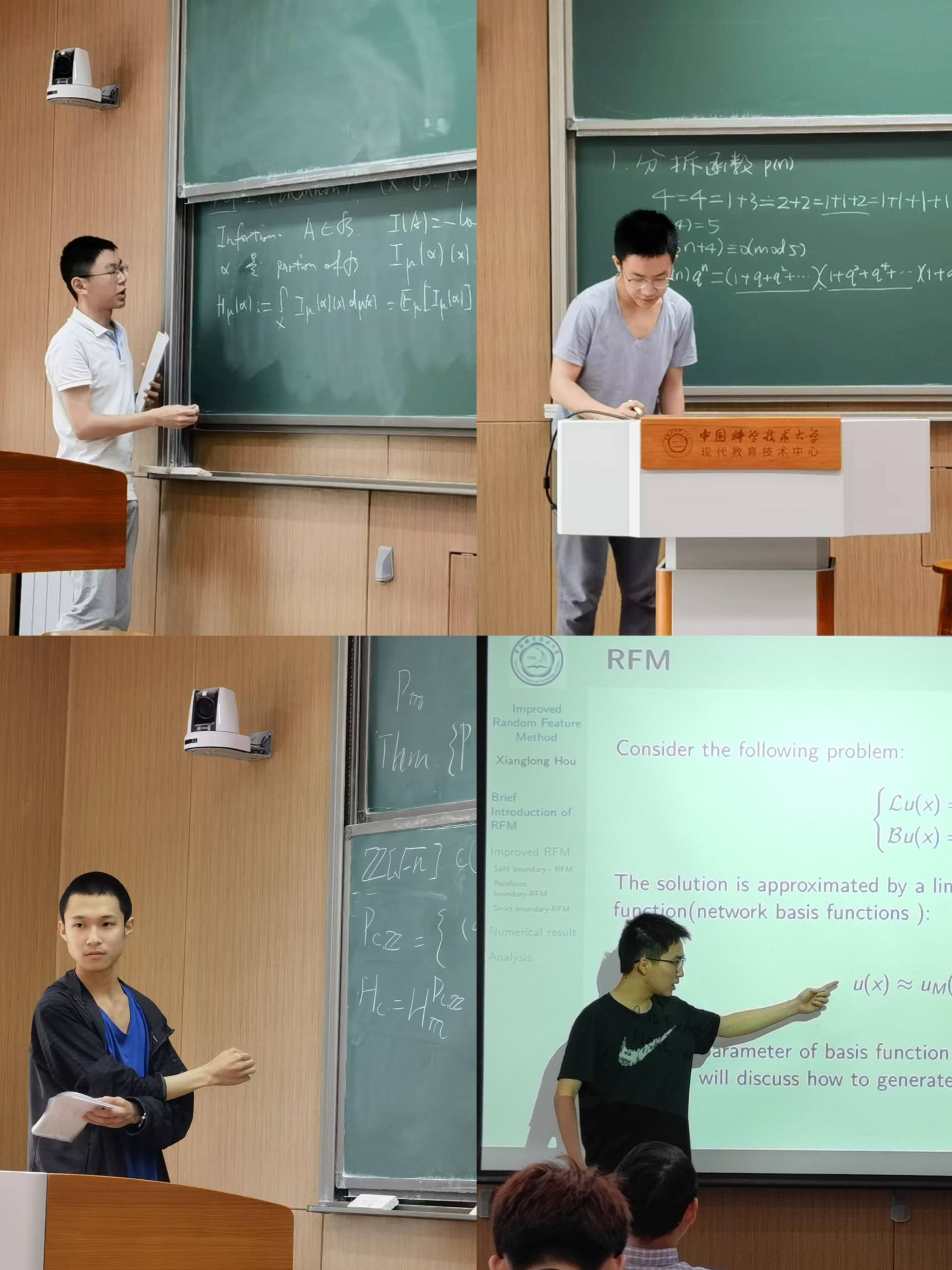 中科大强基班学生包文昊作题为《类域论在不定方程中的应用》的报告。在报告中,他从表素数为整数平方和问题出发,介绍了代数数论的一些基本知识,对能表示成某类平方和的素数给出了一个刻画。中科大强基班学生侯相龙作题为《改进的随机特征方法》的报告。他介绍了随机特征方法,结合具体实例介绍三种改进的随机特征,总结了不同方法的优缺点。