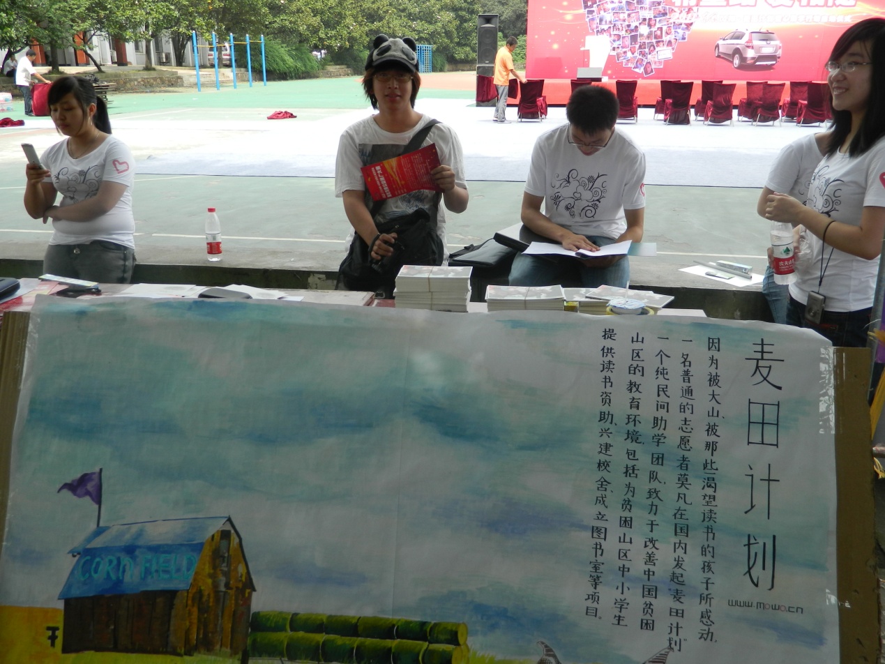 持续了整个白天的图片展的主要内容,是,展出图片,由志愿者向观看者们进行解说。除此之外,还有其他许多小活动。武大数院青协的志愿者们拉开横幅,收集爱心人士们的寄语和签名;发放明信片,并收集了许多爱心人士们想要寄给山区孩子们的明信片;进行毕业募捐,登记募捐名单。这些活动吸引了大批过客的目观。让人们更好地了解麦田计划,感受麦田计划的志愿者精神。身穿白色文化衫的数院青协志愿者和穿着橙色文化衫的麦田计划志愿者作为这场活动的“主角”,在现场忙得不亦乐乎。整个图片展作为启动仪式的前奏,充满了温馨和和谐。