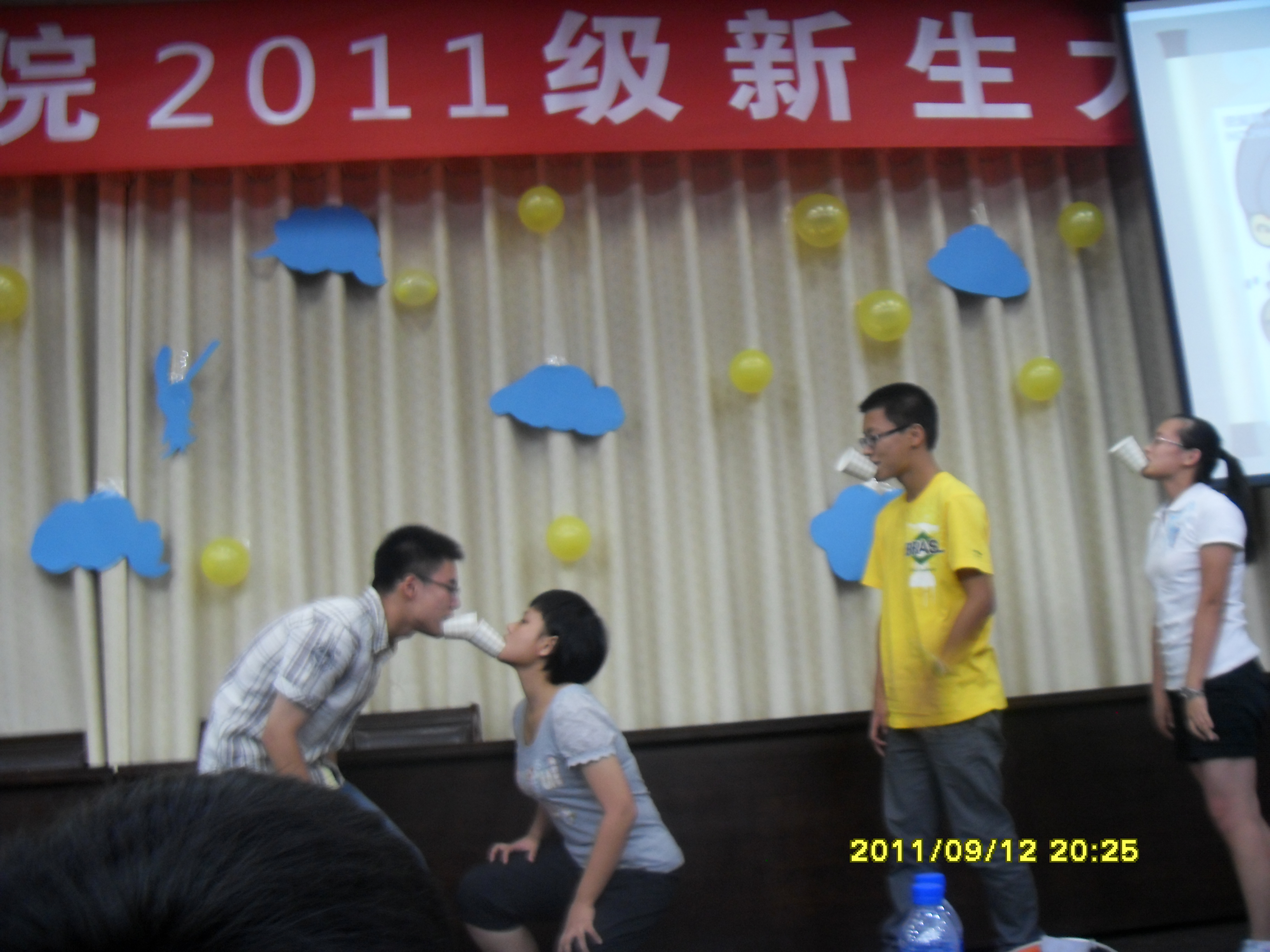 紧接下来的项目便是“乒乓球接龙”,上台的同学口衔纸杯传递一个乒乓球。四组同学争分夺秒,冷静配合,在团队亲密合作中圆满完成任务。