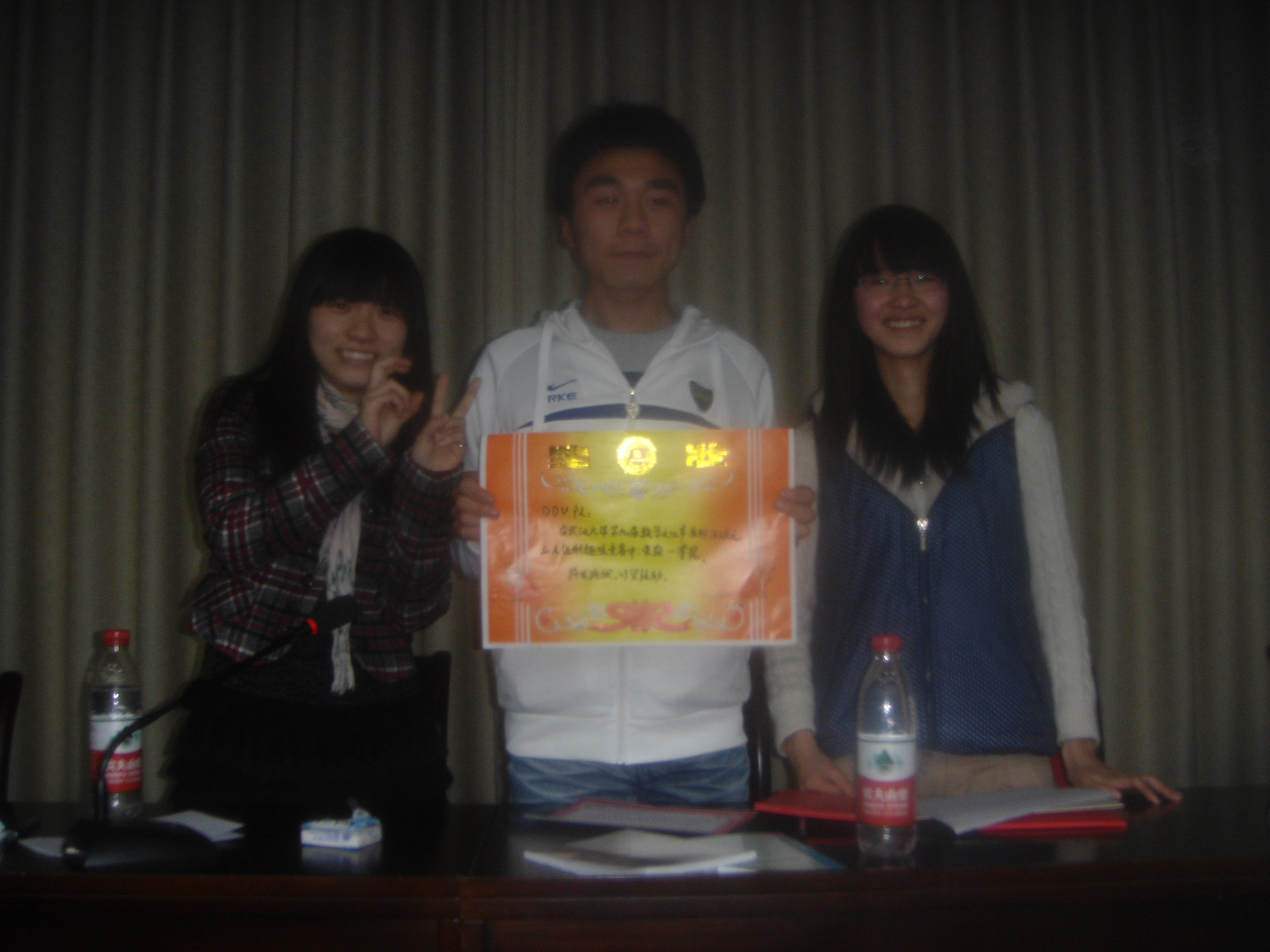 最终,第一名被2010数院+经管院的组合队伍DDU队夺得,分数为650分,二三名分别是来自物院的Little Busters队和来自土建的Winners队获得,分数为520和170分。第九届数学文化节至此圆满落下帷幕,整个活动中,让我们看到了数学与游戏猜谜联系在一块的乐趣。寓教于乐,因为兴趣是最好的老师。同时想对参与组织这次活动的工作人员们说一声,你们辛苦了!希望数院的活动能越办越好!