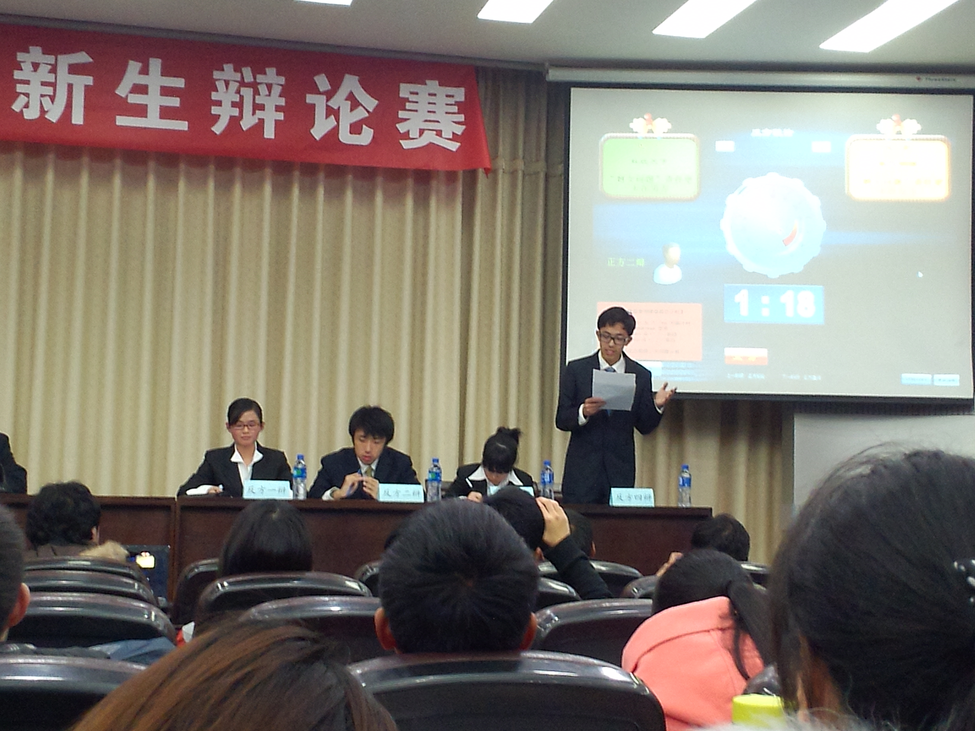 2012级新生辩论赛决赛在数学大会堂举行。经过两场唇枪舌战的精彩比赛,数学基地班的“不对也得队”勇夺桂冠,数学类二班的“V587队”夺得亚军,弘毅班和统计班组成的“毅统天下队”位夺得季军,数学基地班的马行宇同学获得“全程最佳辩手”的称号。