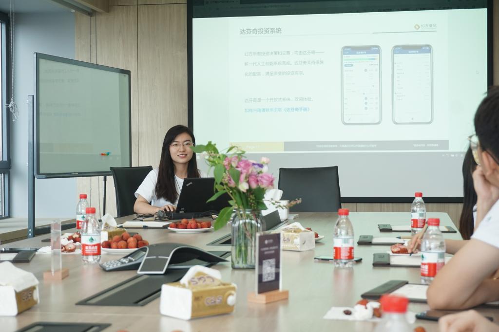 魏爽爽女士首先将我们一行人带到了公司会议室。在这里,魏女士首先对公司的大体状况,人员情况和主营业务做了详细的介绍,并详细阐述了公司的发展历程以及对公司员工的基本要求。同学们听的非常认真,不停在笔记本上记下自己所关心的要点。介绍环节之后是提问环节,简单的寒暄之后,同学们纷纷针对自己最感兴趣的方面进行了详细的咨询。当同学们提到自己作为数学专业的学生,担心自己欠缺一些基础的金融知识时,HR强调工作过程实际也是一个学习过程,入职后会有导师一对一进行针对的辅导,日后再慢慢补习也是完全可行的。相比金融知识,好的数学基础反而在深度学习、人工智能等公司核心业务上更为重要,也会有更强的竞争力。除此之外,数据分析以及深度学习等相关岗位对员工的编程能力要求会比较高。另外比较特别的是,与其余传统金融行业相比,幻方的人员相对较少,主要依靠计算机技术等处理业务,所以相比较实习经历,好的研究经验和科研成果反而会更加加分。