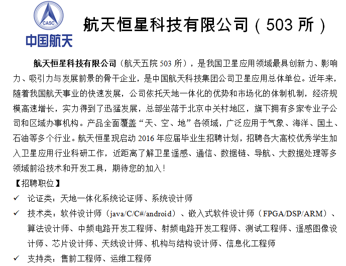 航天恒星科技有限公司暨五院503所,是我国卫星应用领域最具创新力、影响力、吸引力与发展前景的骨干企业,是中国航天科技集团公司卫星应用的总体单位。近年来,随着我国航天事业的快速发展,公司依托天地一体化的优势和市场化的体制机制,经济规模高速增长,实力得到了迅猛发展,旗下拥有多家专业子公司和区域办事机构,总部坐落于北京中关村地区,形成了横跨北京、天津、西安、哈尔滨、南昌、成都的“一区多园”的产业规模。凭借着突出的创新能力和引领能力,公司荣获“中国自主创新科技企业奖”、“2012年度航天技术应用产业先进单位”、中关村国家自主创新示范区“十百千工程”重点培育企业等荣誉称号,是国资委确定的两家中央企业岗位分红权激励试点单位之一。