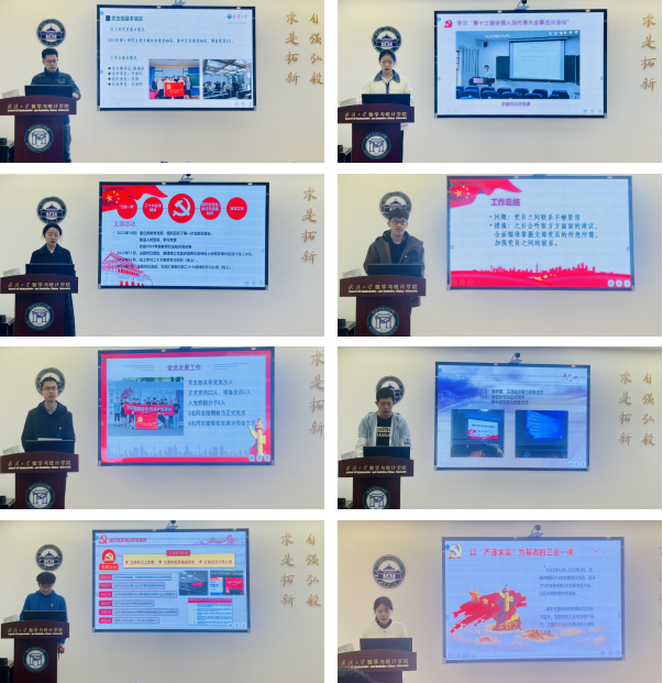 随后,8名研究生党支部书记依次进行PPT述职。各党支部书记聚焦过去一年的组织建设情况、工作开展情况、问题查摆情况和未来规划情况作出总结。在组织建设方面,各党支部高质量完成了党员发展工作,实现了发展对象讲党课全覆盖;在工作开展方面,各党支部实现了支书讲党课全覆盖,博士生宣讲团进支部全覆盖,建立了支部流动制作微党课制度。同时,支部书记对工作中存在的活动形式单一、理论学习与实践联系不紧密、党员潜力挖掘不充分等问题进行了反思剖析。