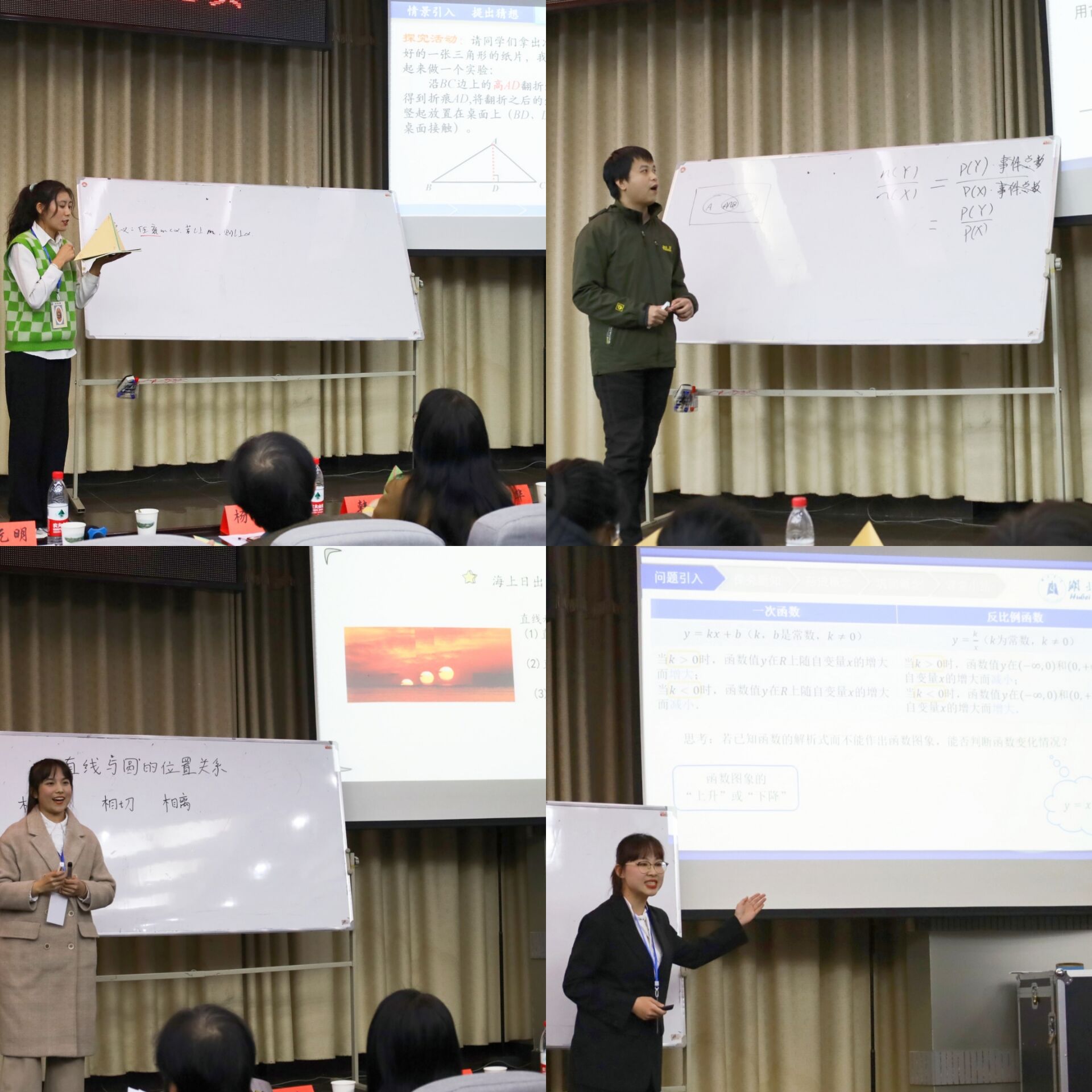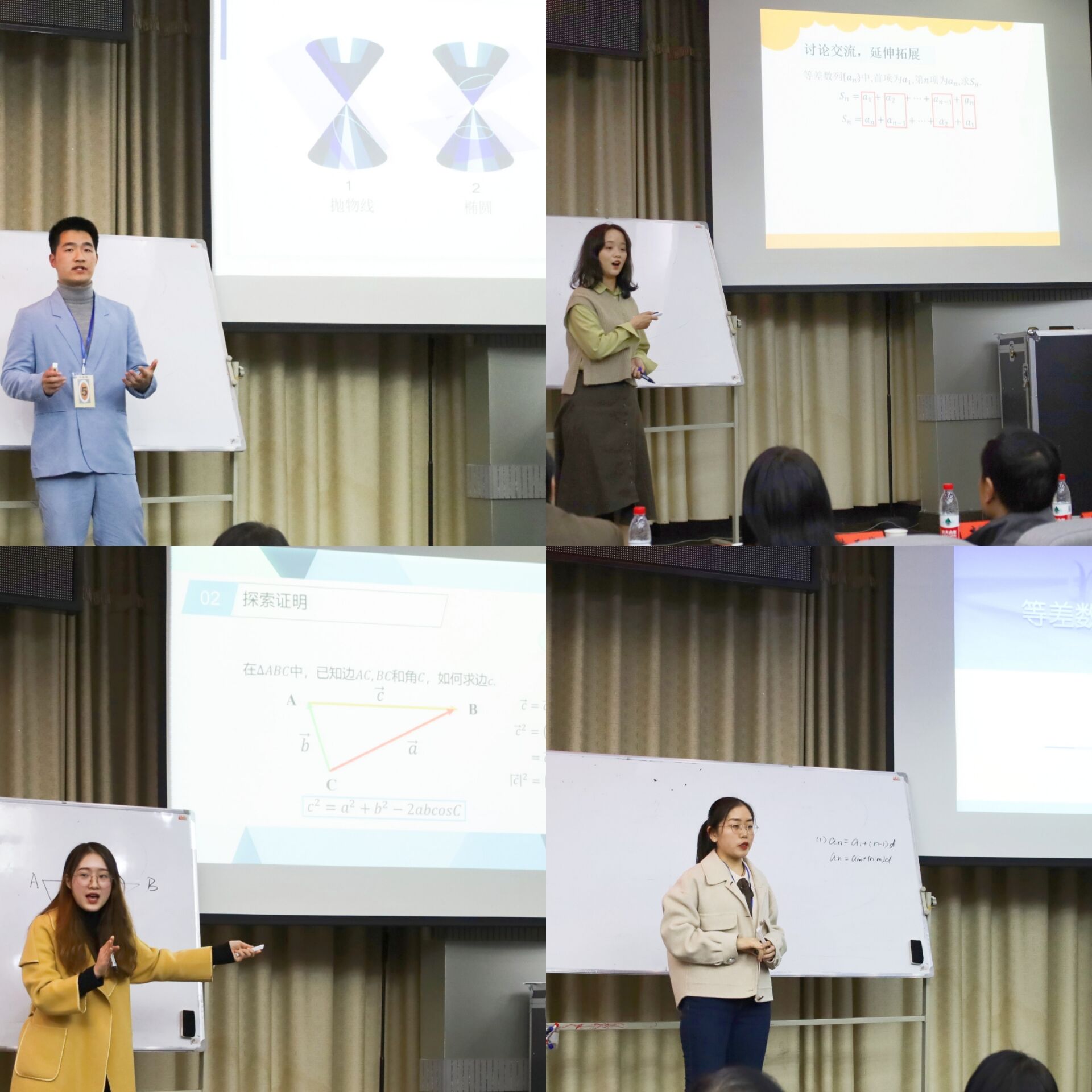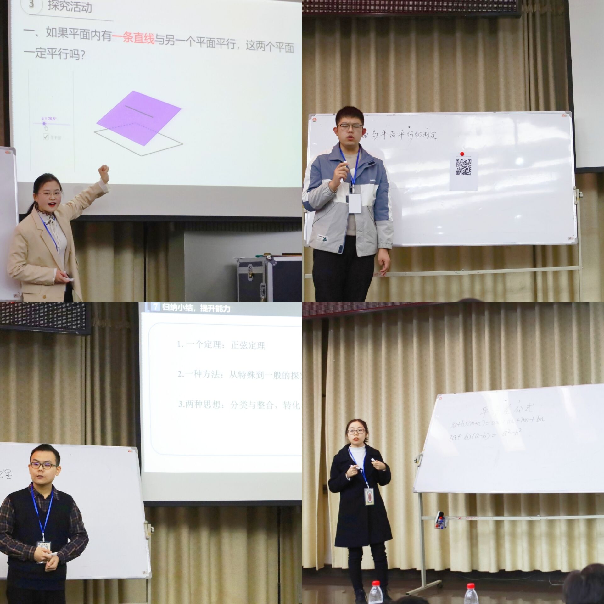 参赛选手们准备充分,按抽签顺序依次进行了精彩的讲授。选手们讲课的内容广泛,涵盖了中学数学的许多重要知识点,如平面与平面平行的判定定理,直线与平面平行的判定定理,正弦定理,平方差公式,椭圆及其它圆锥曲线,等差数列,余弦定理,直线与平面垂直的判定定理,条件概率,直线与圆的位置关系,函数的单调关系等�