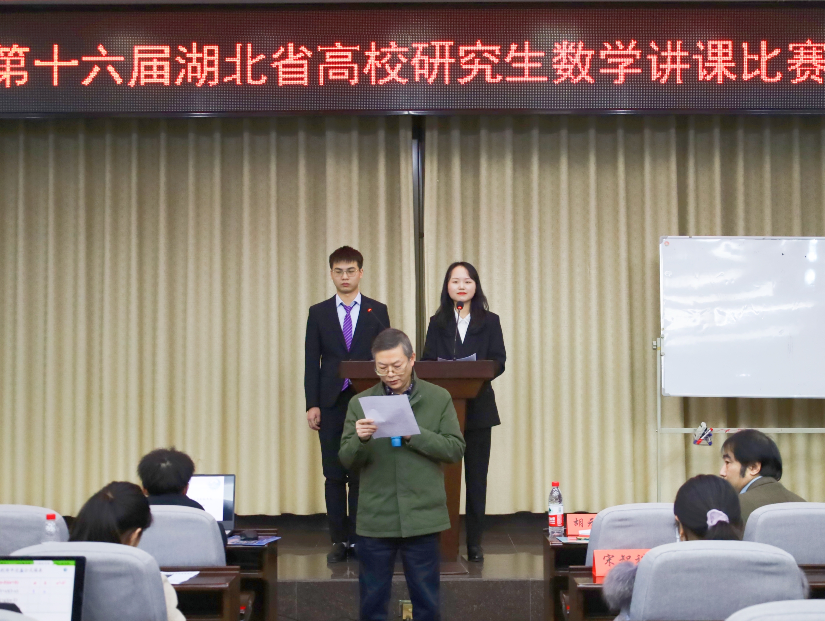 为加强我省研究生讲课的技能、提高我省研究生运用所学知识开展教育教学的能力以及为未来可能走向教师工作岗位的同学提供一个良好的平台�2021�12�10日晚6点整,第十六届湖北省高校研究生数学讲课比赛在数学与统计学院的数学会堂举行�