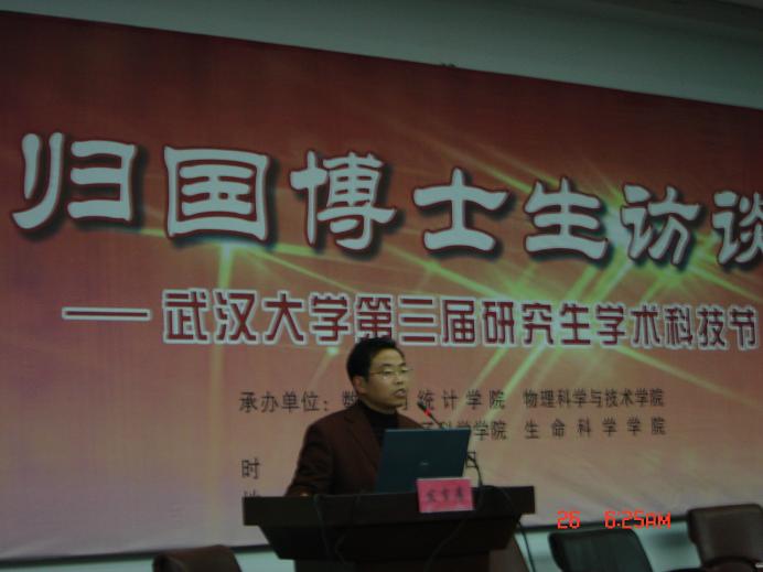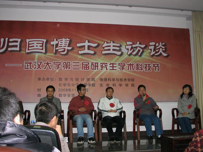的刘伟、朱艳庆、贺福利,物理科学与技术学院的张剑,化学与分子科学学院的付洋,生命科学学院的孙东昌七位归国博士生嘉宾一一上台就座。他们以风趣的语言和丰富的图片向与会的研究生全面介绍了他们在国外的学习、工作、生活情况和留学国家的风土人情,并结合自己的切身体会向大家提出了具体而实际的建议。台下的研究生也不断提出问题,现场气氛非常活跃,活动一直持续了将近四个小时。